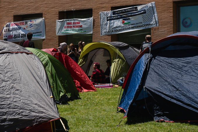 En la capital, la base central del asentamiento está en la Universidad Complutense de Madrid, en las inmediaciones del Edificio de Estudiantes. «Desde el río hasta el mar, Palestina vencerá», fue el lema con el que los estudiantes de recorrieron el campus de Ciudad Universitaria.