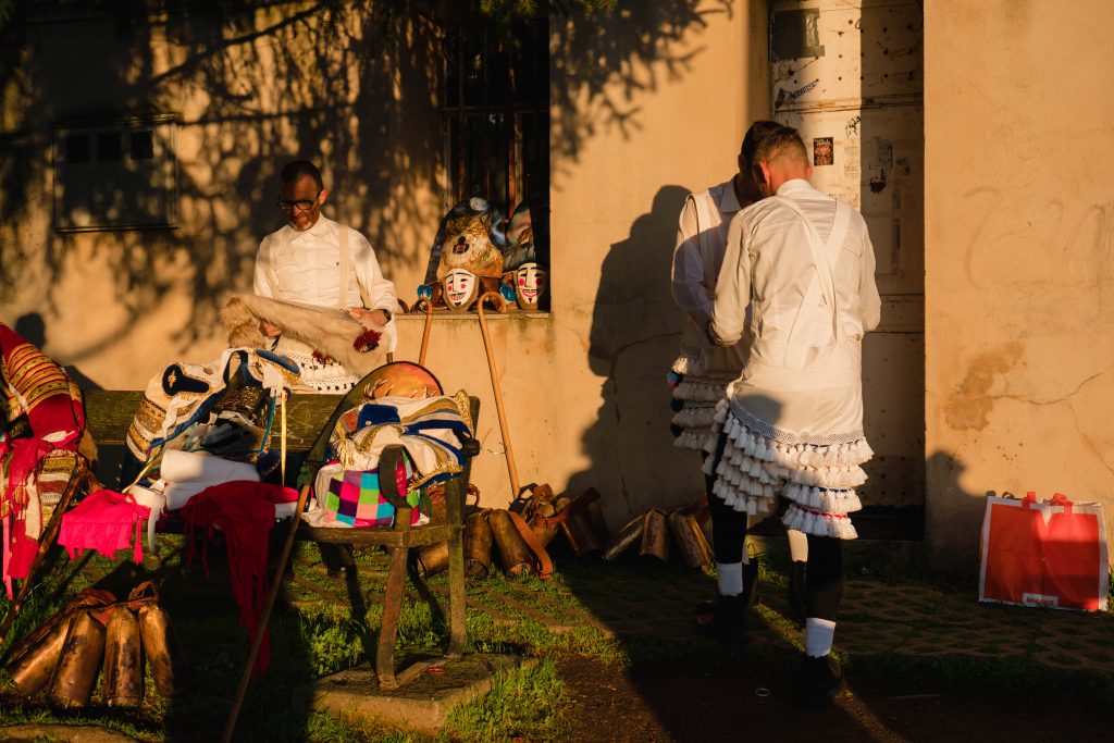El timbre de sus cencerros –o chocas, como se les dice en la zona- se identifica en la distancia. El felo es un disfraz, pero va más allá, es el personaje típico del entroido (carnaval en gallego) de las aldeas de Maceda. Tiene un carácter profundamente anárquico. Su indumentaria parece sacada de un sueño, una especie de traje de luces de torero mezclado con un espíritu animal. Las botas son negras y los calcetines blancos hasta los tobillos. A las medias negras azabache se le sobreponen un pantalón hecho de pompones blancos y rojos. La chaquetilla no puede faltar, y las hay de todos los colores. Cuanto más llamativa, mejor. El felo lleva un rabo de zorro en la parte superior de la máscara, un detalle característico que recuerda sus orígenes más primitivos y salvajes. En la mano porta un cayado, un bastón de madera con el que juega a intimidar y provocar a quienes se encuentra en su camino. Pero lo más importante es la careta, cada una representa a un animal de la fauna de la sierra.