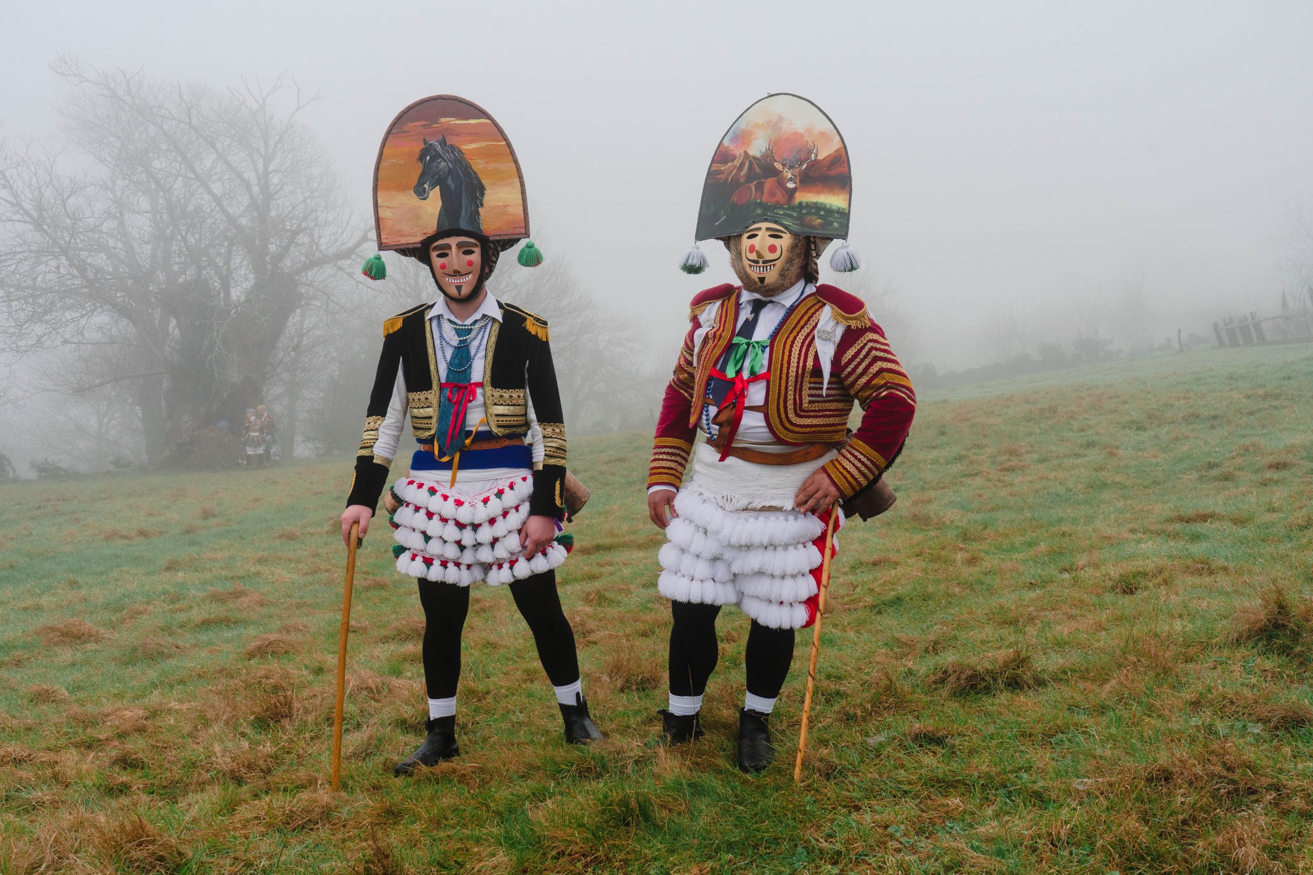 El timbre de sus cencerros –o chocas, como se les dice en la zona- se identifica en la distancia. El felo es un disfraz, pero va más allá, es el personaje típico del entroido (carnaval en gallego) de las aldeas de Maceda. Tiene un carácter profundamente anárquico. Su indumentaria parece sacada de un sueño, una especie de traje de luces de torero mezclado con un espíritu animal. Las botas son negras y los calcetines blancos hasta los tobillos. A las medias negras azabache se le sobreponen un pantalón hecho de pompones blancos y rojos. La chaquetilla no puede faltar, y las hay de todos los colores. Cuanto más llamativa, mejor. El felo lleva un rabo de zorro en la parte superior de la máscara, un detalle característico que recuerda sus orígenes más primitivos y salvajes. En la mano porta un cayado, un bastón de madera con el que juega a intimidar y provocar a quienes se encuentra en su camino. Pero lo más importante es la careta, cada una representa a un animal de la fauna de la sierra.