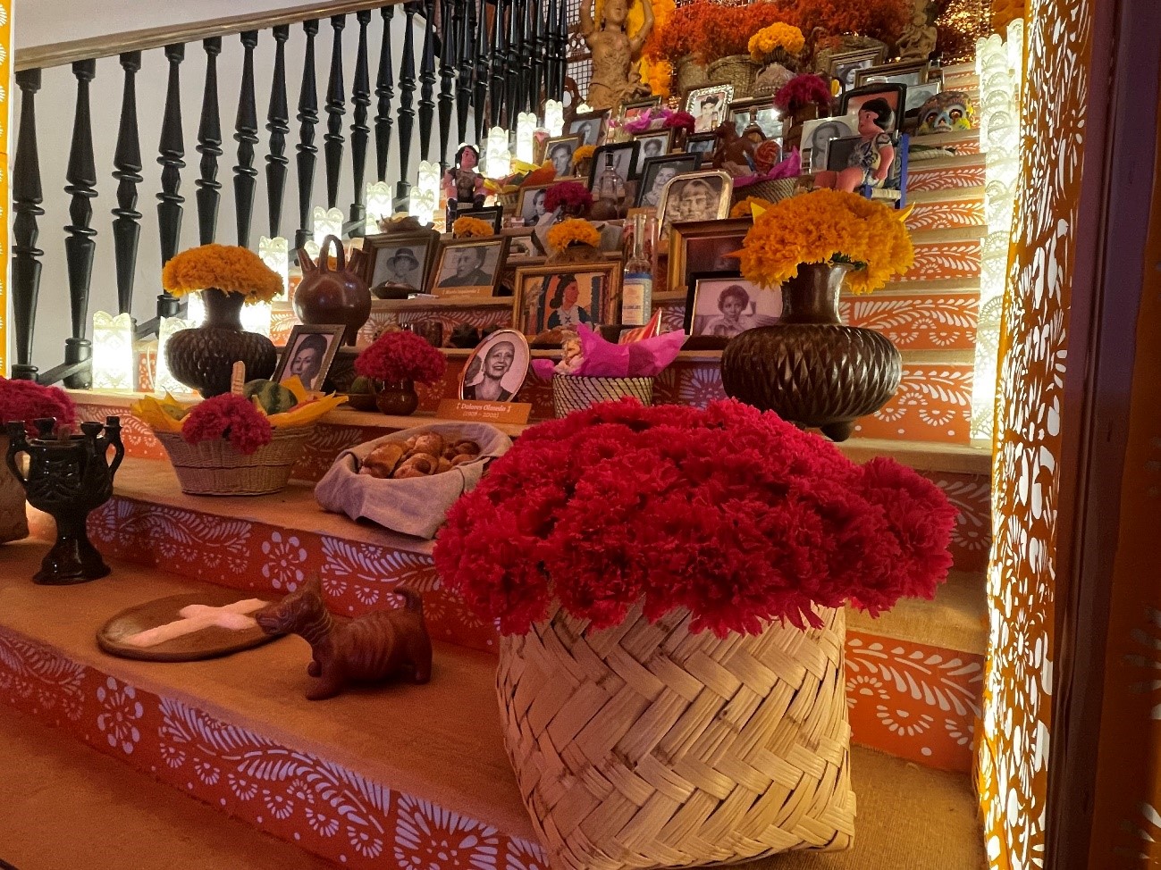 Ubicado, como cada otoño, en la escalera emblemática que el edificio utiliza para sus diseños más potentes, el altar está compuesto por treinta fotografías en blanco y negro de las protagonistas. Junto a ellas, los objetos recurrentes de este tipo de tradición: cestas de fruta y “pan de muerto” (alimento dulce mexicano típico de la festividad), botellas de tequila y mezcal, agua, vasijas y figuras. Y todo rodeado por velas, que iluminan y sirven de guía para que los espíritus reconozcan el camino al hogar, y por cientos de flores de cempasúchil elaboradas en papel. La flor cempasúchil, con la que los mexicanos adornan sus casas, es el símbolo de la dualidad entre la vida y la muerte y sólo se cultiva en ese país.