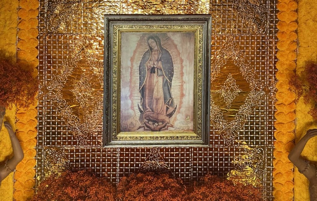 La culminación del altar se da en su pared de fondo y en el entorno que enmarca todo, donde se aprecia la obra de Pedro Ortega Lozano, maestro en el arte popular mexicano, que mantiene la tradición del uso del cincel y el martillo para hacer papel picado, el material que Casa de México utiliza cada año para su altar. Con él, la creación adquiere un aspecto que recuerda al muralismo de los artistas mexicanos, gracias a los 46 metros cuadrados de este papel picado metalizado y sus dos enormes catrinas a los lados, que miran hacia la escalinata. En el centro del lugar, un gran cuadro de la Virgen de Guadalupe, patrona de México, corona la escena. Una monumental obra de manualidades (todo el material está hecho artesanalmente) que, como reconoce la directora de cultura del centro, Susana Pliego, demuestra el afán de la institución por ofrecer propuestas diferentes en temas y colores, ya que “cada año es un reto presentar algo diferente al público”.