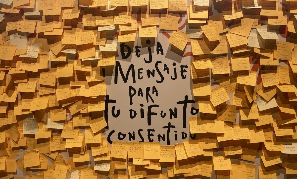 Esta diferencia cultural se hace visible gracias a su iniciativa interactiva, una pared de pósits que ya es frecuente en las exposiciones de la Casa, donde se invita a los visitantes a participar dejando un mensaje o reflexión para sus propios difuntos. Como afirma Pliego: “A todos se nos ha muerto alguien y todos vamos a morir. Por eso, mejor saber que los muertos regresan y que están siempre con nosotros”.