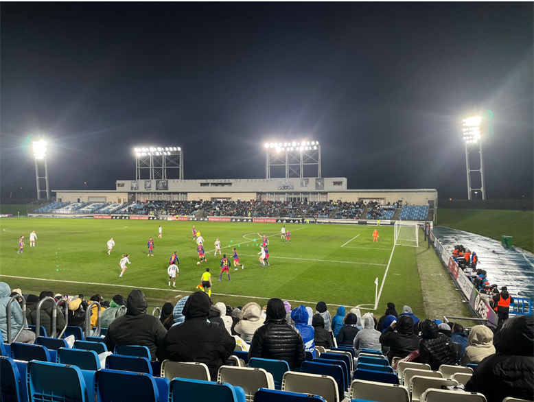 El partido comenzó tranquilo. Ambos conjuntos presionaban y jugaban a su estilo: el Madrid presionando arriba para que las defensas culés cometieran algún error y el equipo catalán tocando el balón sin prisa. Los aficionados animaban cada acción con sus cánticos. La primera ocasión clara del partido la tuvo el conjunto local de la mano de Athenea, quien quedó mano a mano contra Cata Coll. Sin embargo, la cántabra decidió recortar en vez de chutar y perdió la oportunidad de abrir el marcador.
