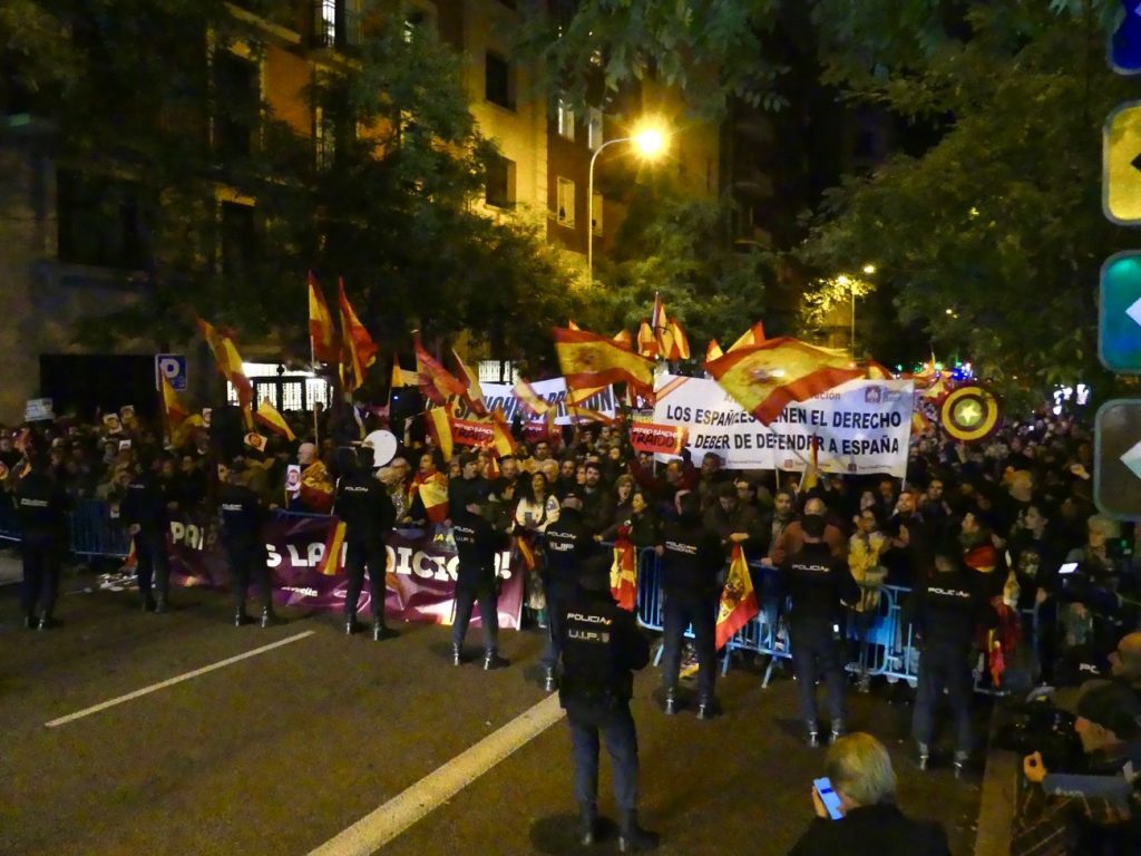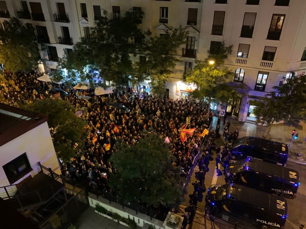 Pero no ha sido fácil. Las dos semanas previas a la sesión de investidura del presidente, la tensión en la calle se palpaba en las manifestaciones convocadas en la calle de Ferraz, frente a la sede nacional del partido. La primera mitad del mes de noviembre se ha caracterizado por contenedores ardiendo, manifestantes saltando el vallado que proporcionó la Unidad de Intervención Policial (UIP) para proteger la sede y detenciones por desobediencia y atentados contra la autoridad.