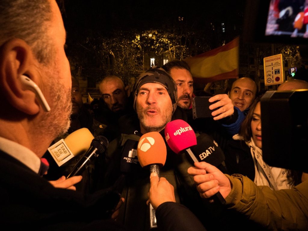 7 de noviembre. Daniel Esteve, CEO de ‘Desokupa’, responde a los medios de comunicación durante la manifestación que se dirigía hacia Gran Vía. Foto: Pedro Pascual.