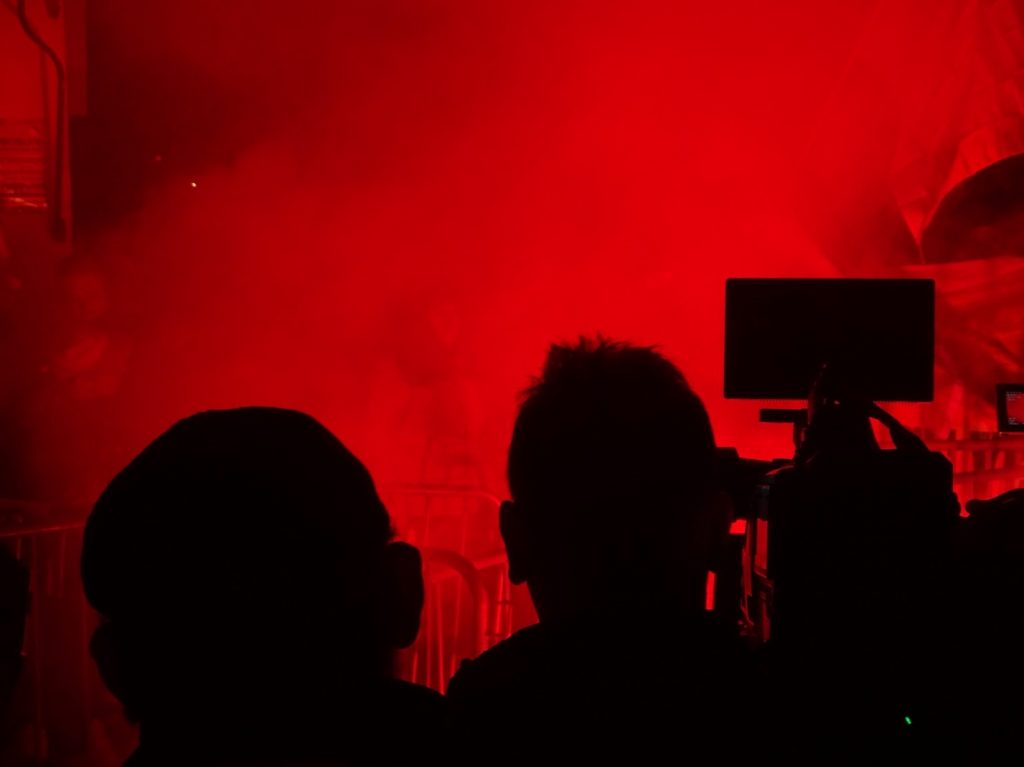 7 de noviembre. Los medios de comunicación cubren la manifestación desde la zona de prensa en el momento en que los asistentes encienden una bengala. Foto: Natalia Loizaga.