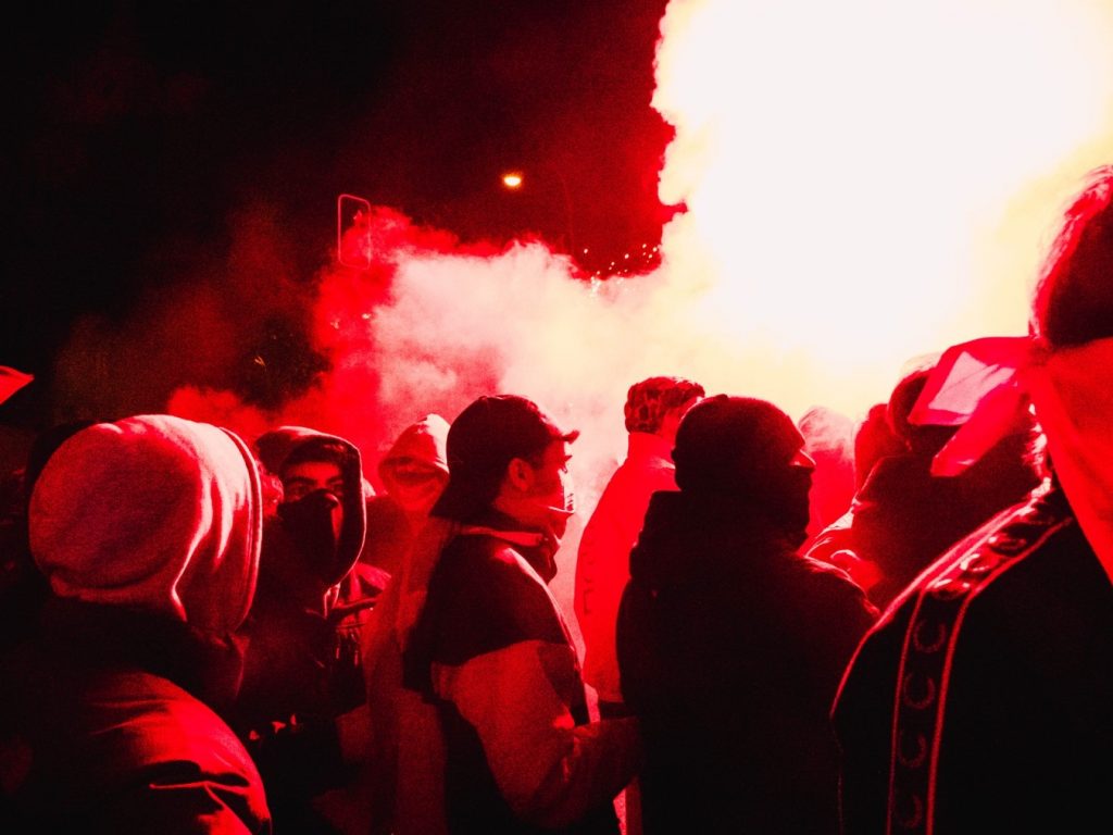 17 de noviembre. Un pequeño grupo de manifestantes hace una sentada mientras los ultras se dispersan por las calles adyacentes. Foto: Natalia Loizaga.