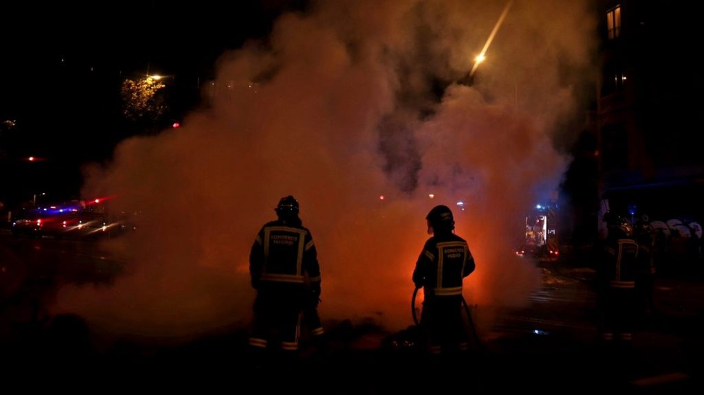 7 de noviembre. Efectivos del SAMUR caminan por el cruce entre la calle de Ferraz y Marqués de Urquijo entre destrozos y furgones policiales. Foto: Pedro Pascual.