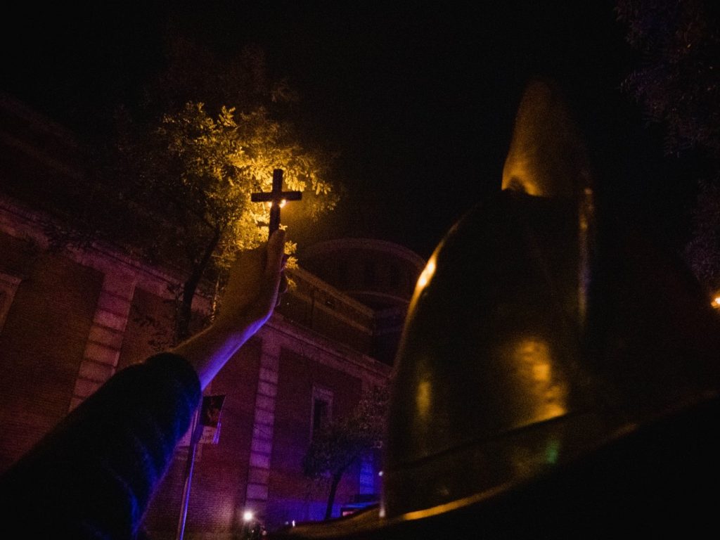 15 de noviembre. Un manifestante alza una cruz católica entre la muchedumbre. Foto: Pedro Pascual.