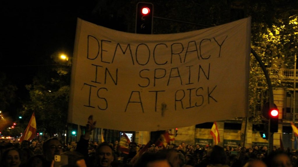 6 de noviembre. Una de las pancartas vistas en la manifestación: “La democracia en España está en riesgo”. Foto: Mario Morón.