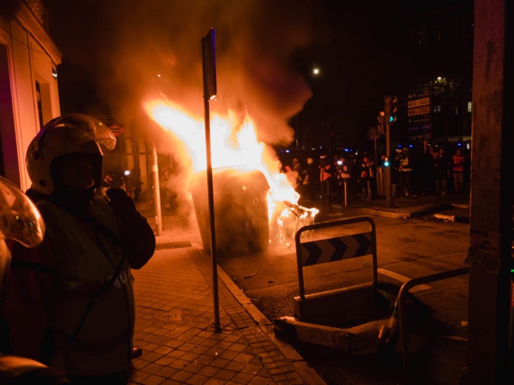 17 de noviembre. Arde un contenedor en la decimocuarta noche de protestas en Ferraz. Foto: Pedro Pascual.