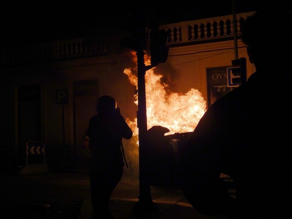 17 de noviembre. Un periodista toma fotos de un contenedor ardiendo en la calle de la Princesa. Foto: Natalia Loizaga.