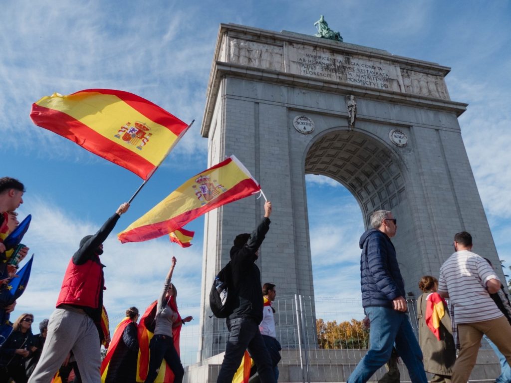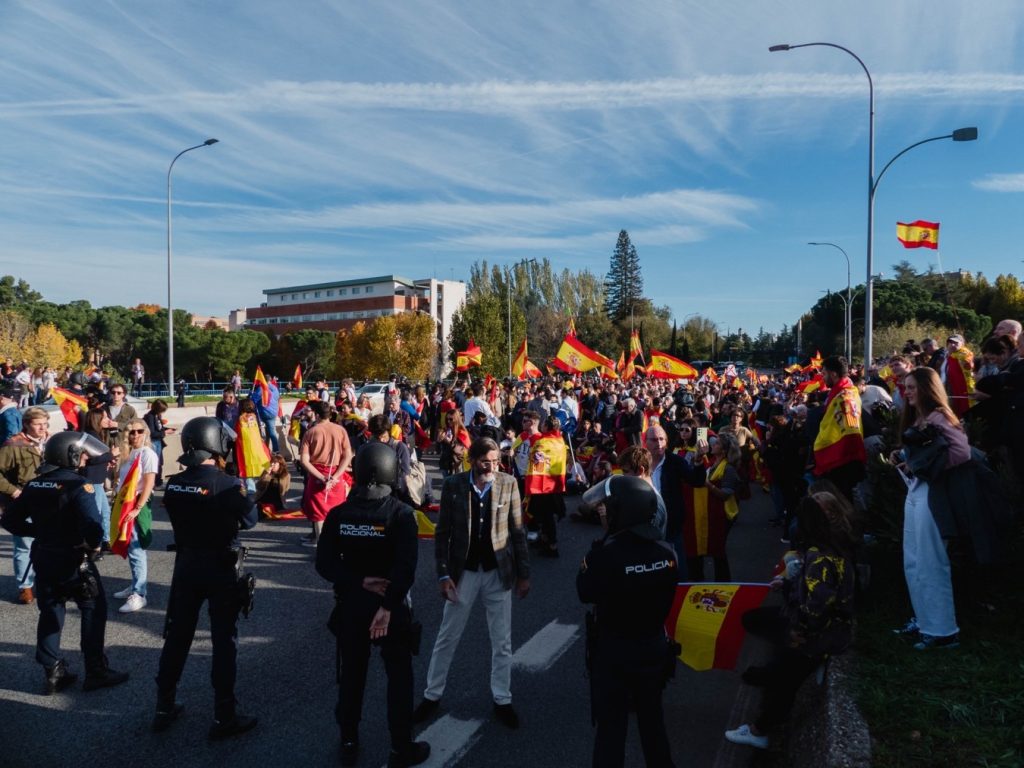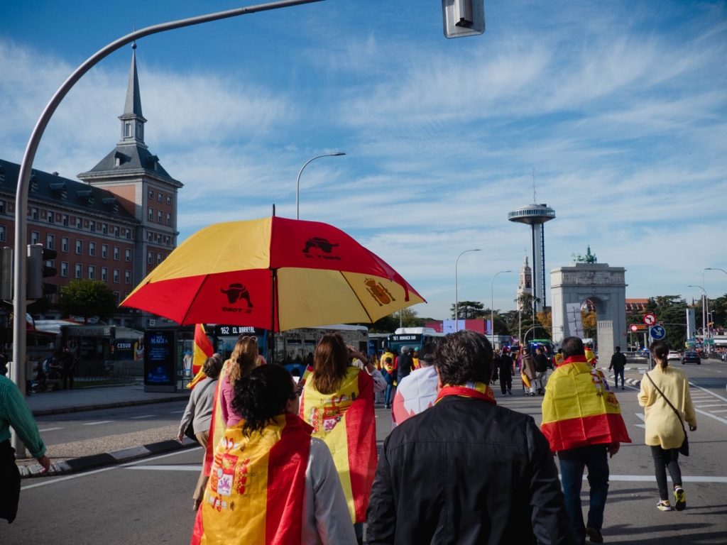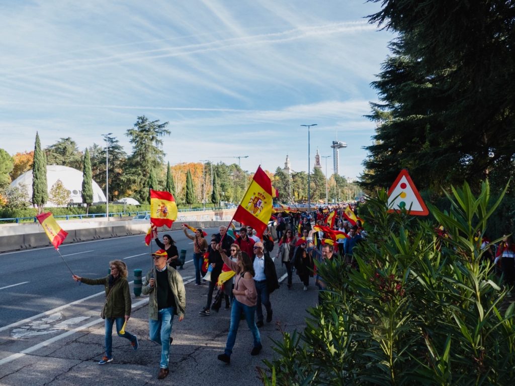 18 de noviembre. Los manifestantes, envueltos en banderas de España, caminan por Moncloa tras acudir a la multitudinaria manifestación en Cibeles. Foto: Pedro Pascual.