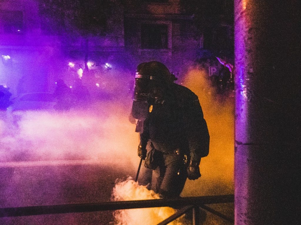 6 de noviembre. Un agente, entre gases y botes de humo lanzados contra los manifestantes para disolver la manifestación. Foto: Pedro Pascual.