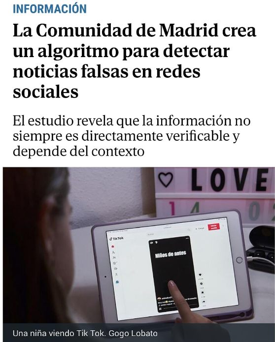 La Comunidad de Madrid ha creado HypergraphDis, un algoritmo que sirve para detectar y desmentir noticias falsas en redes sociales como Twitter. Este proyecto utiliza la inteligencia artificial más avanzada para mejorar la precisión y rapidez de desinformación. Además, incluye una campaña de concienciación para educar a los ciudadanos sobre la verificación de información antes de difundirla. Esta iniciativa es una de las medidas que la Comunidad de Madrid ha tomado para luchar contra la desinformación, colaborando con medios de comunicación y promoviendo herramientas de verificación de hechos.
