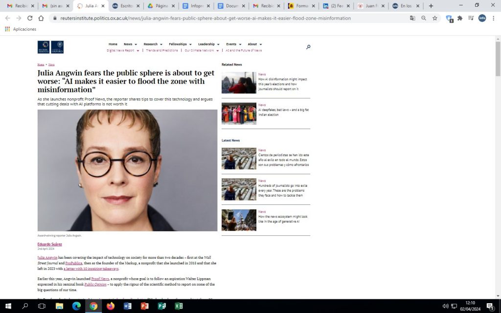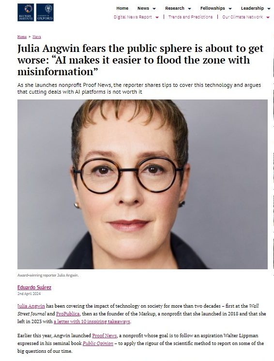 Julia Angwin lleva más de dos décadas cubriendo el impacto de la tecnología en la sociedad, primero en el Wall Street Journal y ProPublica, y después como fundadora de Markup, una organización sin ánimo de lucro que puso en marcha en 2018. En la entrevista, Angwin habla de cómo cree que los periodistas deben informar sobre el auge de la Inteligencia Artificial y comparte su opinión sobre algunos de los retos a los que se enfrenta el periodismo en la actualidad. Link al artículo completo: https://reutersinstitute.politics.ox.ac.uk/news/julia-angwin-fears-public-sphere-about-get-worse-ai-makes-it-easier-flood-zone-misinformation