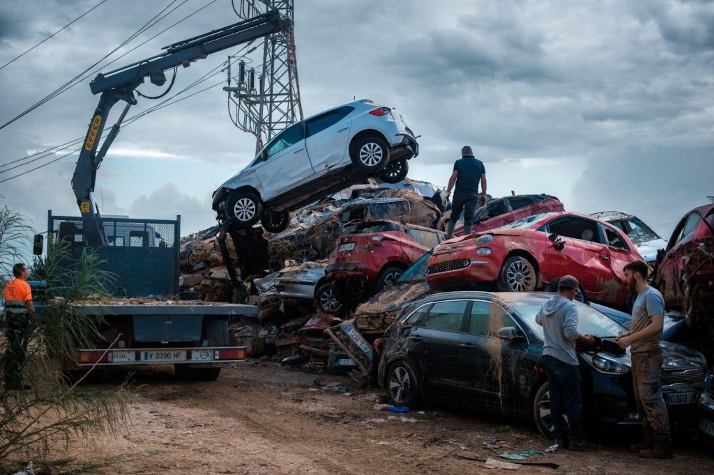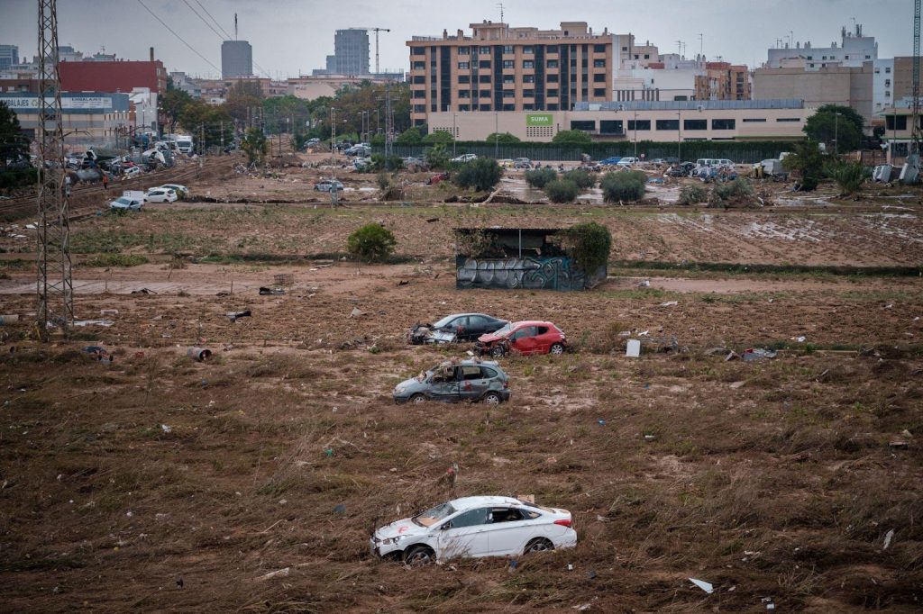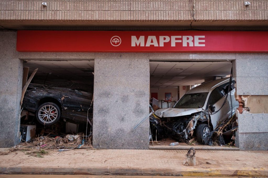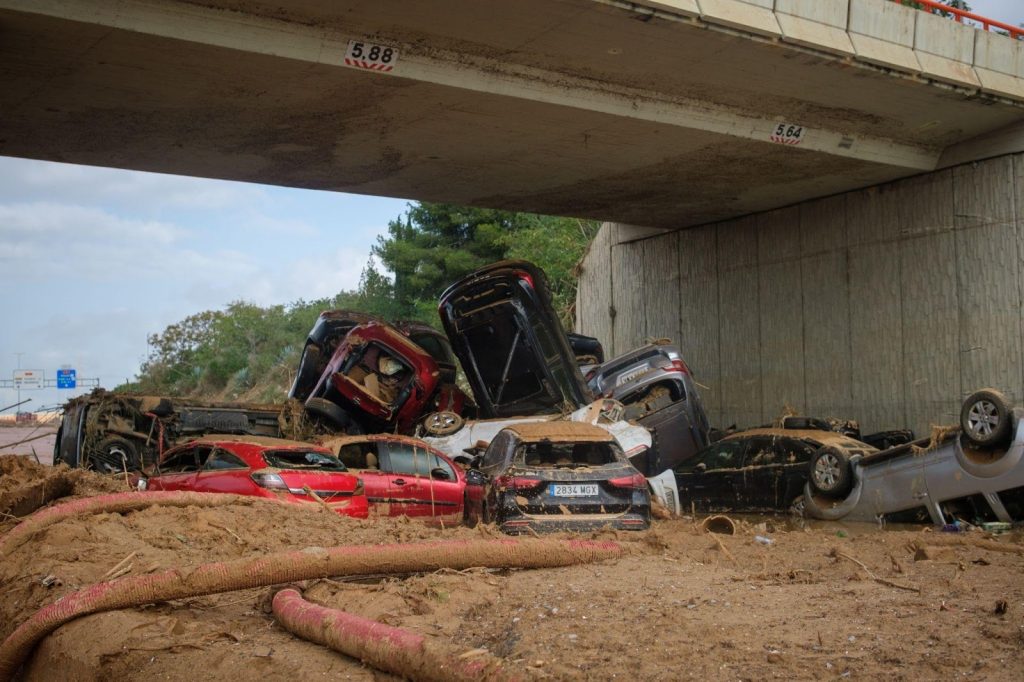 Salimos hacia Paiporta por la mañana. En coche, solo pudimos avanzar hasta la entrada del barrio de San Marcelino, donde un policía nos cortó el paso. «¿Me entiendes?», le dijo a Alejandro. Nada le podía molestar más que eso. «Sí, claro que te entiendo, hablo castellano», respondió mientras giraba para dar la vuelta. Aparcamos en un KFC, donde un cartel advertía «parking solo para clientes». Emprendimos el camino a pie; nos esperaban cinco kilómetros hasta Paiporta. En el trayecto, pronto empezamos a ver cosas en posiciones inusuales, como farolas y carteles en horizontal o coches en vertical.