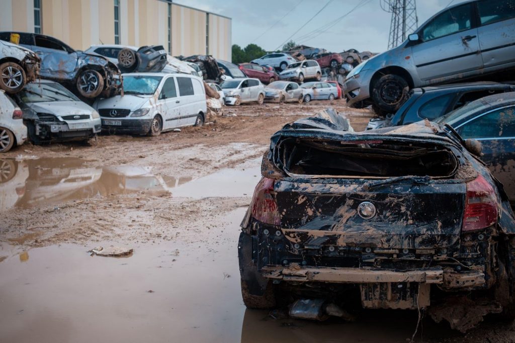 A mediodía, los equipos de rescate y algunos bomberos de Málaga, Marbella y Mallorca, que estaban de voluntarios en sus días libres, hicieron una pausa para comer. Mientras tanto, cogimos el coche para desplazarnos al Ikea de Alfafar, en cuyo parking alguien había dicho que se estaban buscando cadáveres. Ese trayecto en coche me mostró el lado más inhumano y desolador de la tragedia. Una vez que sales de los pueblos, no hay calor humano, solo destrucción. En un puente, un agente nos detuvo para dejar pasar a camiones militares. Al llegar a Alfafar, cuatro personas embarradas, con cámaras al hombro, recorrimos una carretera desierta esquivando coches volcados, con campos y cultivos destruidos a ambos lados. Las famosas naranjas de Valencia, manchadas de barro y con algún vehículo entre los naranjos, decoraban el paisaje. No pude evitar pensar en algunas escenas de la película Civil War en las que Jessie Cullen, la joven aspirante a fotógrafa de guerra, viaja en coche con colegas a los que admira mientras fotografía la guerra en su país.