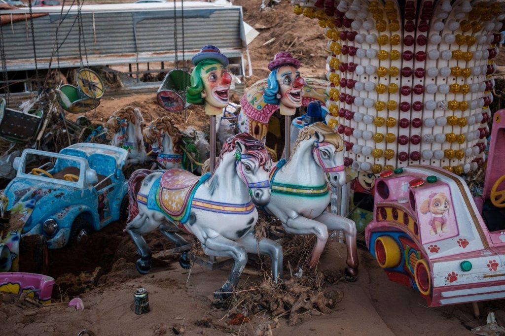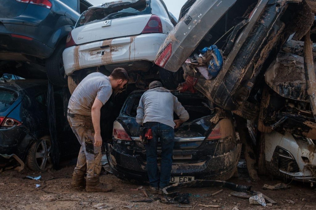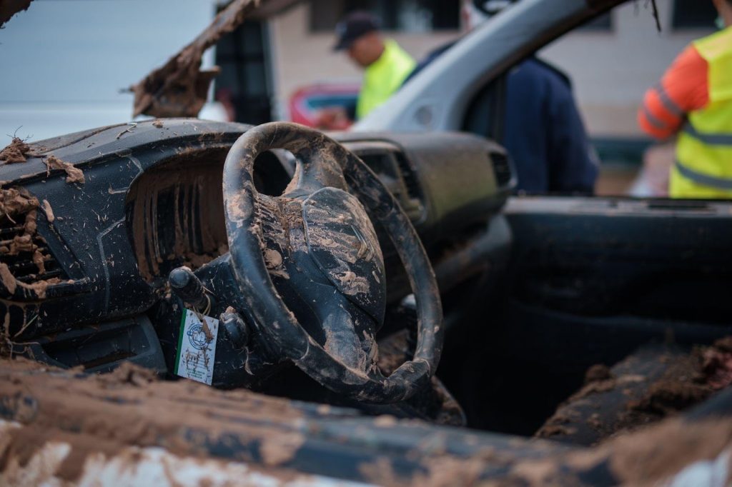 Alejandro saludó a un bombero que, junto a sus compañeros, comenzaba a sacar agua del aparcamiento con una bomba. Se habían conocido en un campo de refugiados de Lesbos (Grecia), donde el bombero trabajaba como voluntario. Nos contó que el aparcamiento estaba lleno de agua, barro y basura, y que hasta que el nivel no bajara a la altura de una ventanilla de coche, no podrían saber si había cuerpos dentro.