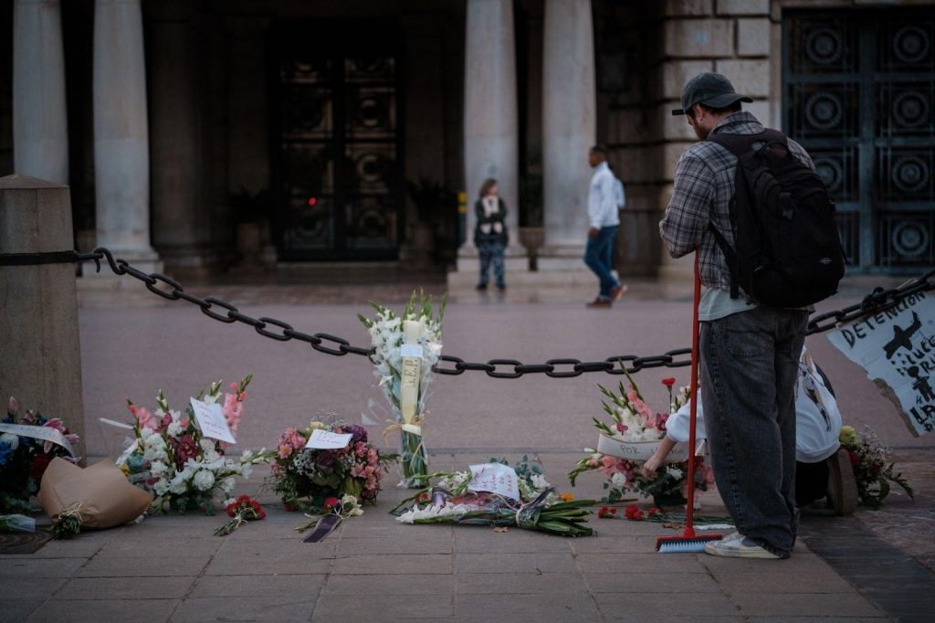 Llegué a la estación de autobuses de Valencia el sábado por la tarde. Alejandro Martínez Vélez, fotoperiodista colaborador de Europa Press, estaba en Chiva trabajando para The Times. Me dijo: «Estoy con un redactor guiri, pero se va hoy; cuando lo deje en el aeropuerto, te recojo». Tenía un par de horas libres hasta entonces y empecé a andar sin un rumbo concreto. Nunca había estado en Valencia. Se respiraba una absoluta normalidad, salvo por unas cuantas flores y un lazo negro en la plaza del Ayuntamiento, donde un grupo de niños jugaba alrededor de un pompero gigante, y muchas personas que iban en bicicleta con bolsas de basura atadas hasta las rodillas, una clara señal de lo que me esperaba al día siguiente.