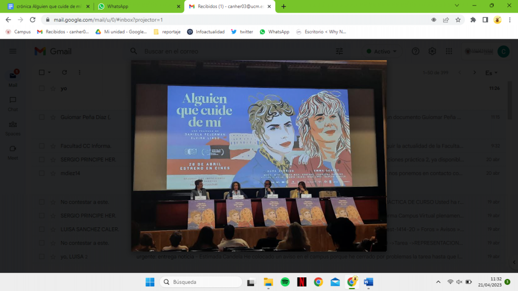 La Facultad de Ciencias de la Información acogió el pasado jueves 20 de abril el último preestreno organizado por la Escuela de Producción de este curso. La película que se proyectó fue Alguien que cuide de mí y, como es habitual, tras la proyección se celebró un coloquio en el que participaron sus directoras, Elvira Lindo y Daniela Fejerman, y el actor Víctor Clavijo, que interpreta a uno de los personajes. Emma Suárez no pudo asistir por motivos de salud.