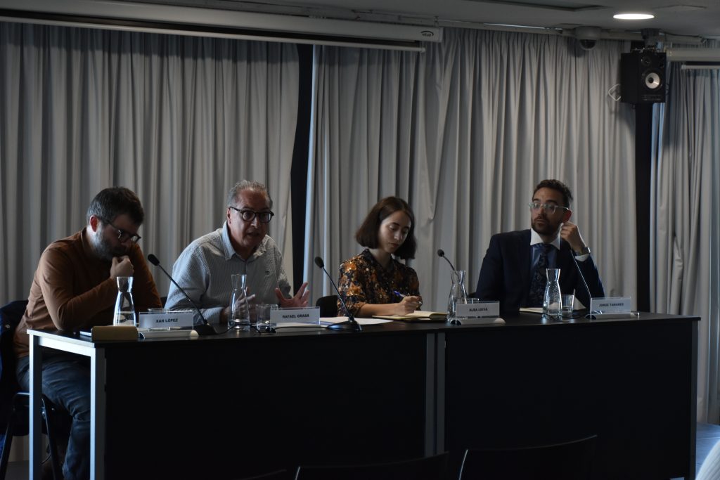 Por su parte, Xan López, explicó la tendencia que está tomando el mundo de volver a una división de bloques en Occidente y Oriente. También propuso su visión de un modelo político de la UE en el que tres conceptos contrapuestos se deben unir: el antimilitarismo, la geopolítica y el derecho a la defensa de los países.