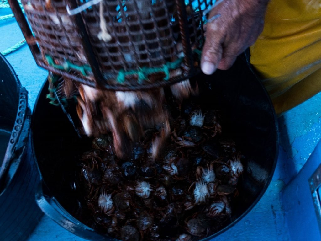 Roberto, el patrón, y su hermano Manuel, usarán el aparejo conocido como palangre o línea. Consiste en un peso atado a una boya al que se le añade un sedal con una línea de anzuelos. Ponen en cada anzuelo un patelo, una especie de cangrejo por el que las lubinas tienen predilección. Lo patelos deben permanecer vivos, así que los enganchan al anzuelo por una esquina de su concha. Si estuvieran muertos, las lubinas no querrían comérselos. Los róbalos ven su manjar y lo engullen quedando enganchados a la línea. Sólo valen las hembras, los machos “son más peleones -explican- y se defienden más de las lubinas”.
