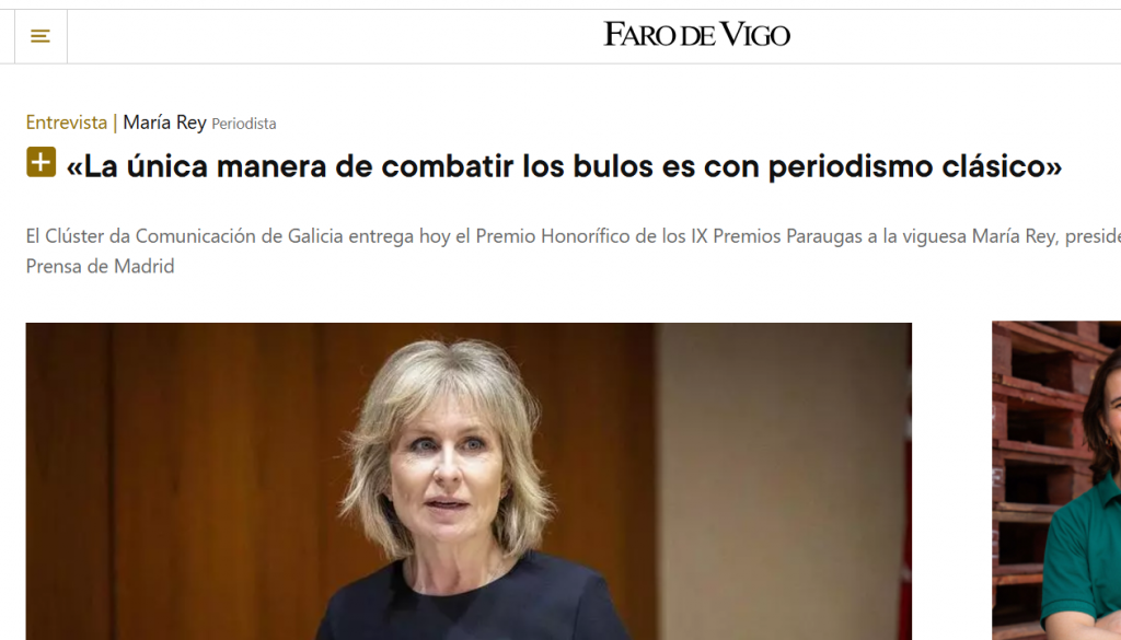 La XI edición de los Premios Paraugas, del sector de la comunicación, marketing, publicidad y eventos, ha galardonado a la periodista gallega María Rey. En esta entrevista publicada en Faro de Vigo, Rey reflexiona sobre la situación actual del periodismo, narra sus inicios y sus momentos más felices en la profesión.