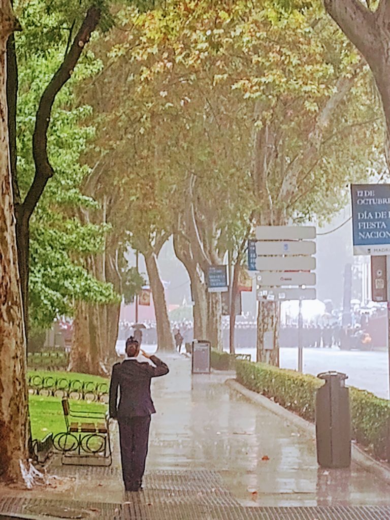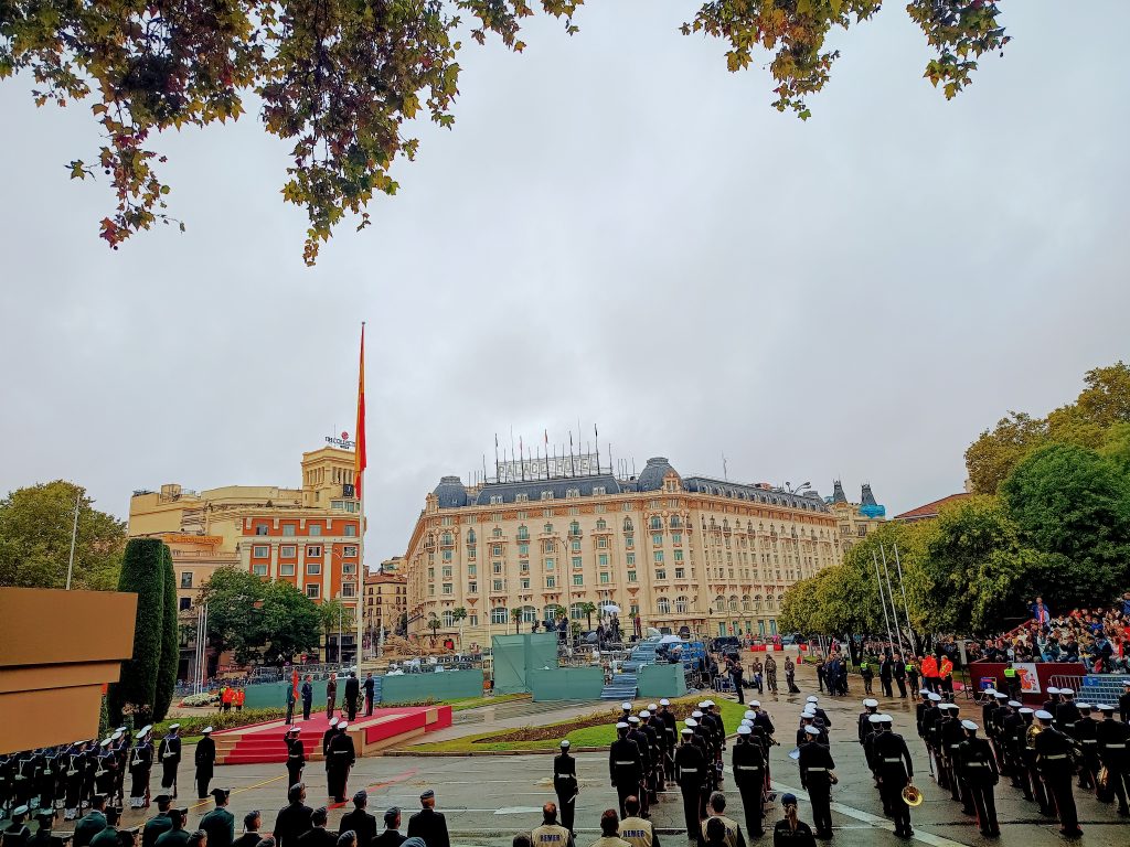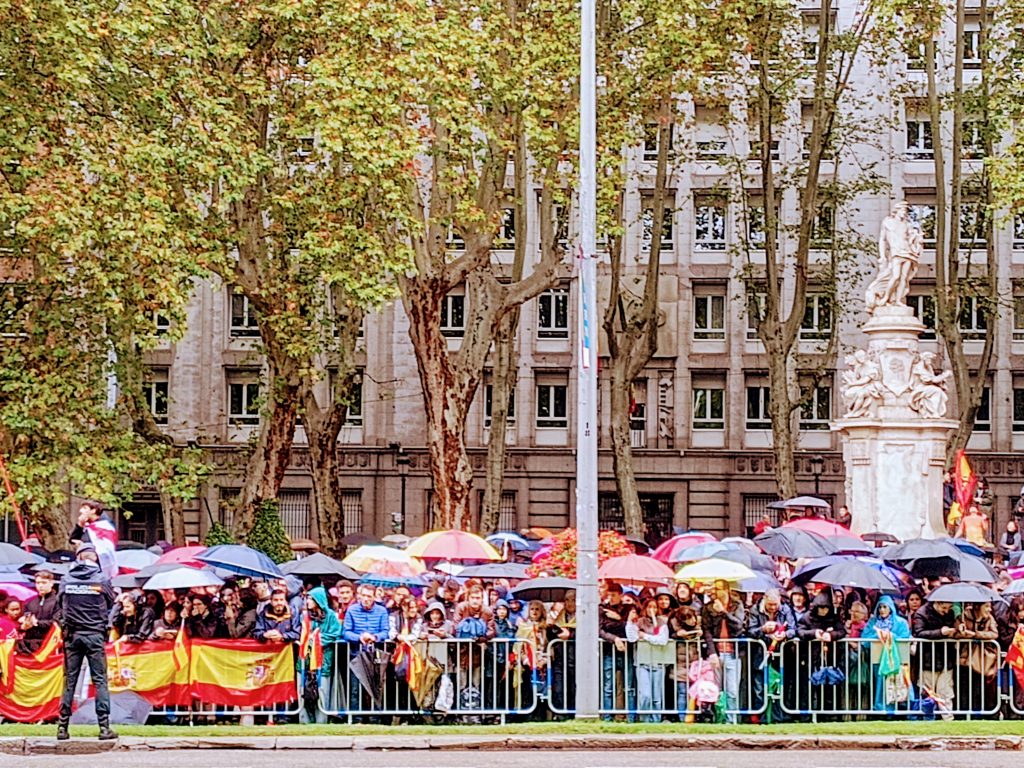 La lluvia y el frío fueron los protagonistas del desfile militar del 12 de octubre en Madrid, que reunió a miles de personas a lo largo del paseo del Prado y Recoletos, desde la glorieta del emperador Carlos V hasta la plaza de Colón. La lluvia cayó durante todo el acto con diferente intensidad y sólo en su última parte cesó, justo en el momento de arriado de la bandera nacional que ponía punto final al acto.