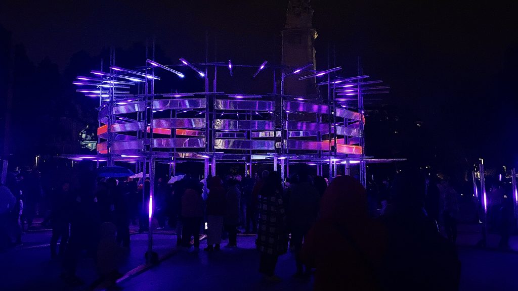 Al hablar de arte, las personas se suelen imaginar cuadros de óleo de Goya, no construcciones de metal, espejos, luces y música. Por eso, antes de que la lluvia hiciera acto de presencia, un sitio tan emblemático como la Plaza de España se encontraba repleta de gente que observaba un espectáculo atípico. “Es la primera vez que escucho de estas cosas. No sabía que el arte involucraba bombillas”, comentaba Luis, completamente embelesado con el cambio de luces al son de la música. Él era uno de los encargados de vigilar Kankakt Extended, la obra de Nicolas Polozzi con la que el público podía interactuar para ver las diferentes facetas que presentaba.