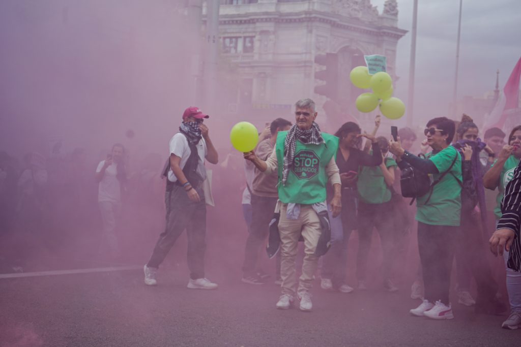 En la calle se escuchaba “¡Vergüenza!”, mientras desfilaba la militancia de Podemos, donde se esperaba la aparición de Irene Montero y Ione Belarra, que se habían dejado ver al inicio de la manifestación. Sólo pasaron los militantes: unos empujan y regañan por desesperación, otros desfilan discretamente con las cabezas bajas.