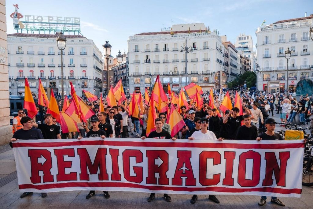 Por un lado, unos 300 simpatizantes de Falange Española, en su mayoría adolescentes vestidos de negro, desfilaron por la calle Preciados coreando consignas xenófobas y ultranacionalistas. Bajo el lema “Remigración. Por unos barrios seguros”, exigieron la expulsión de todos los inmigrantes no blancos ni cristianos, en lo que denominan un plan “para salvar Occidente”. Su media de edad rozaba los 18 años, y muchos portaban banderas españolas sin el escudo constitucional.