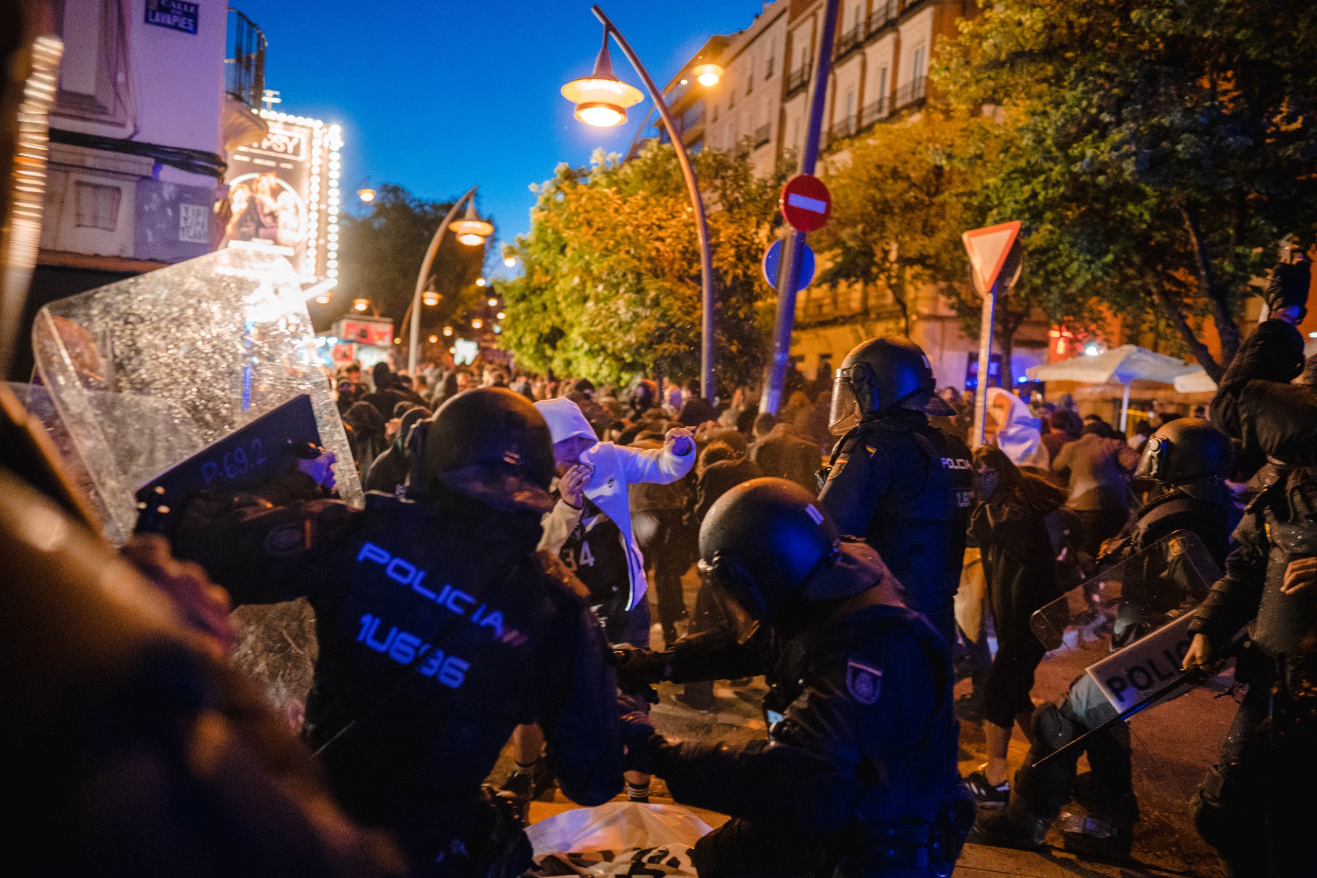 Poco después de las diez de la noche, se vivió el momento más tenso de la jornada cuando un grupo de manifestantes antifascistas intentó romper un cordón policial. La respuesta de los antidisturbios fue inmediata: varios disparos al aire, uso de porras y gas pimienta para dispersar la protesta. La plaza se vació en minutos.