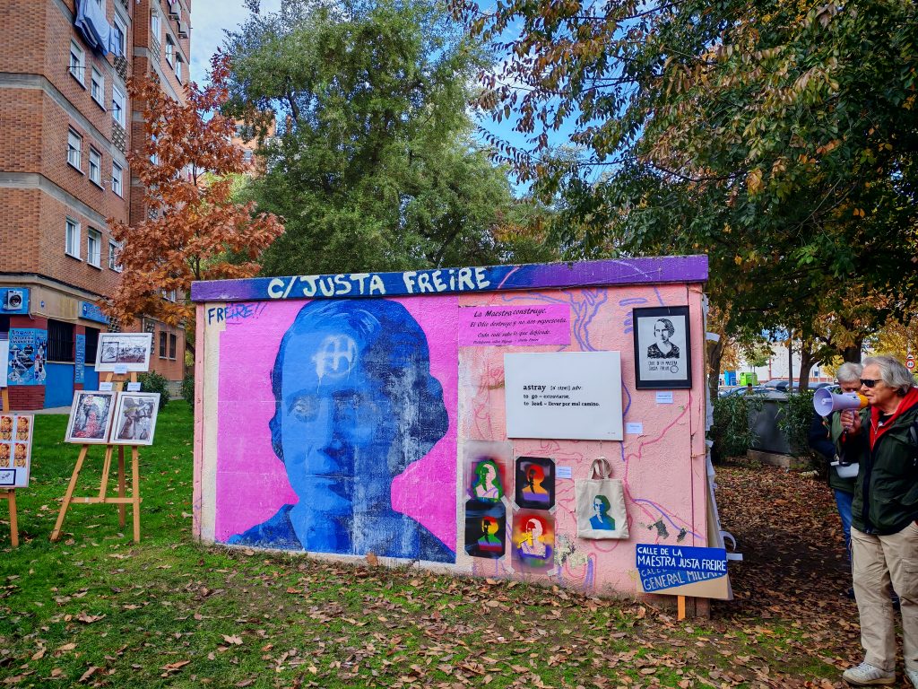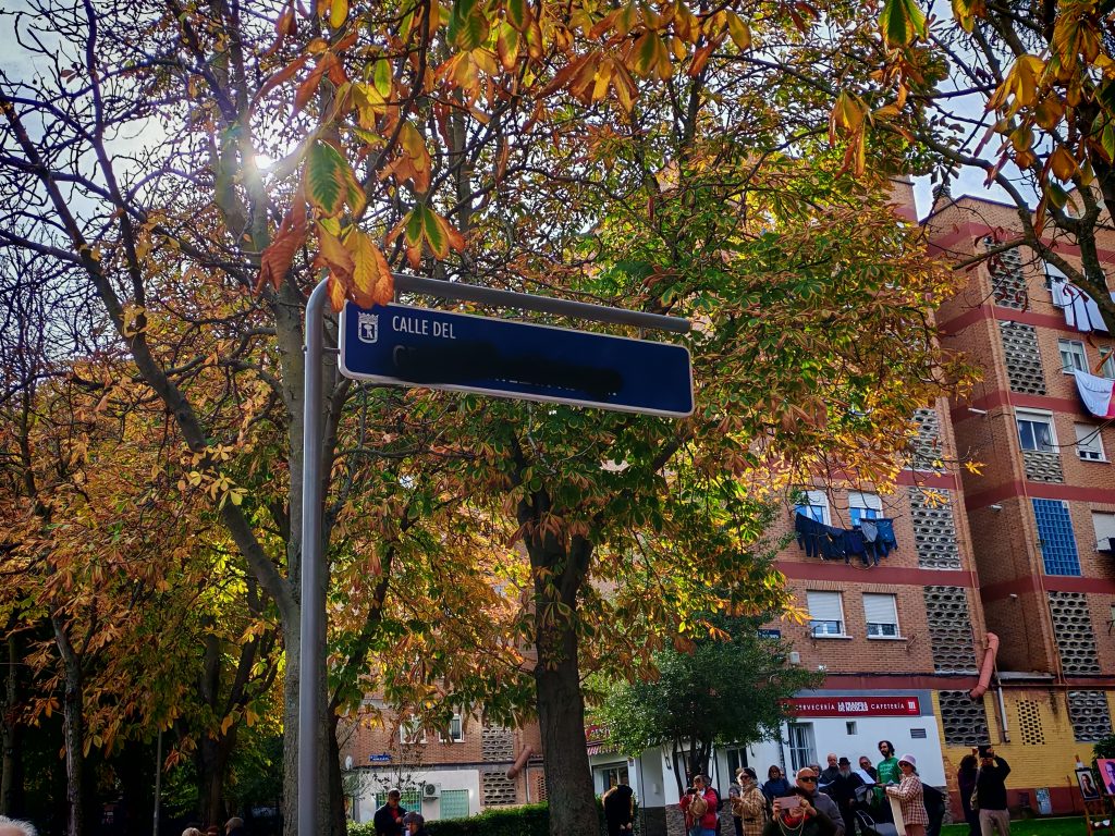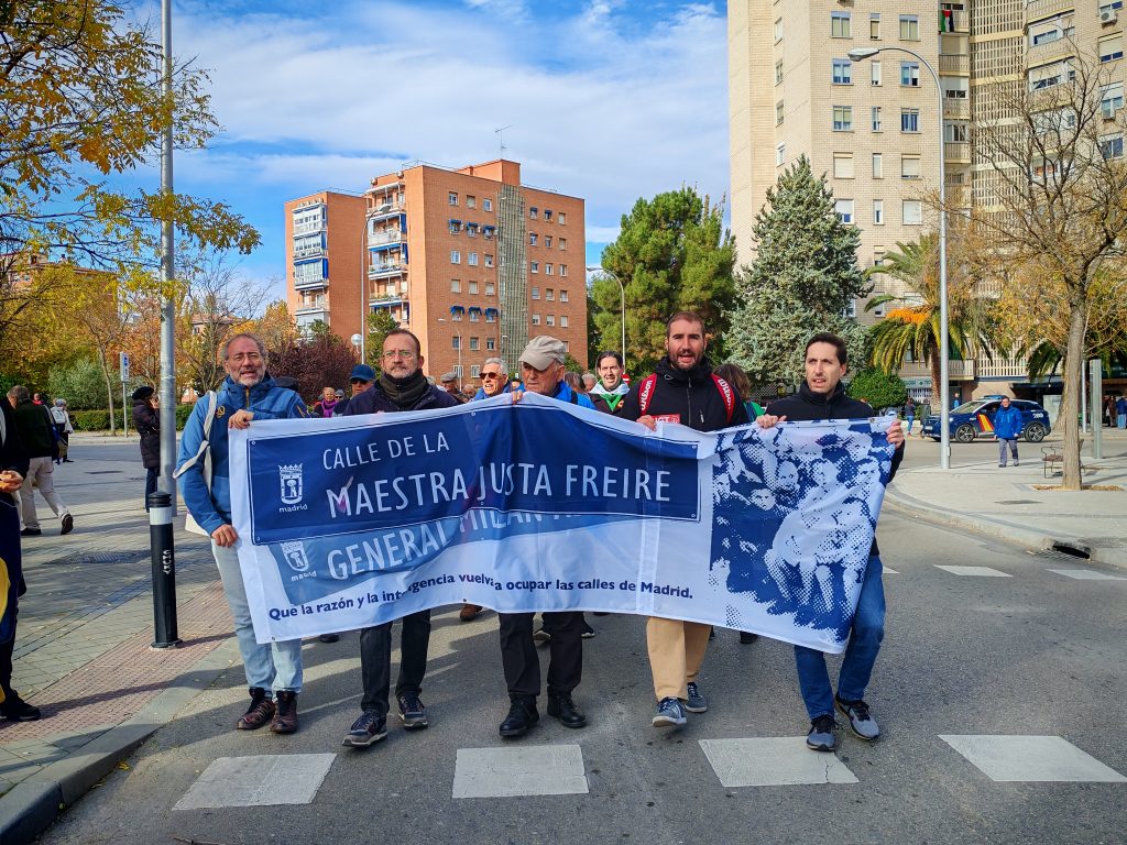 El debate sobre la memoria histórica volvió a las calles de Madrid el domingo 23 de noviembre. A mediodía, un grupo de ciudadanos se reunió para marchar desde la estación de Cercanías Maestra Justa Freire hasta el mural dedicado a la maestra en la calle Blas Cabrera. La manifestación, convocada por la Plataforma Calles Dignas, buscaba impulsar una reivindicación que llevan años defendiendo: que el Ayuntamiento de Madrid renombre la calle General Millán Astray, bautizada así en 1969 como homenaje al fundador de la Legión.