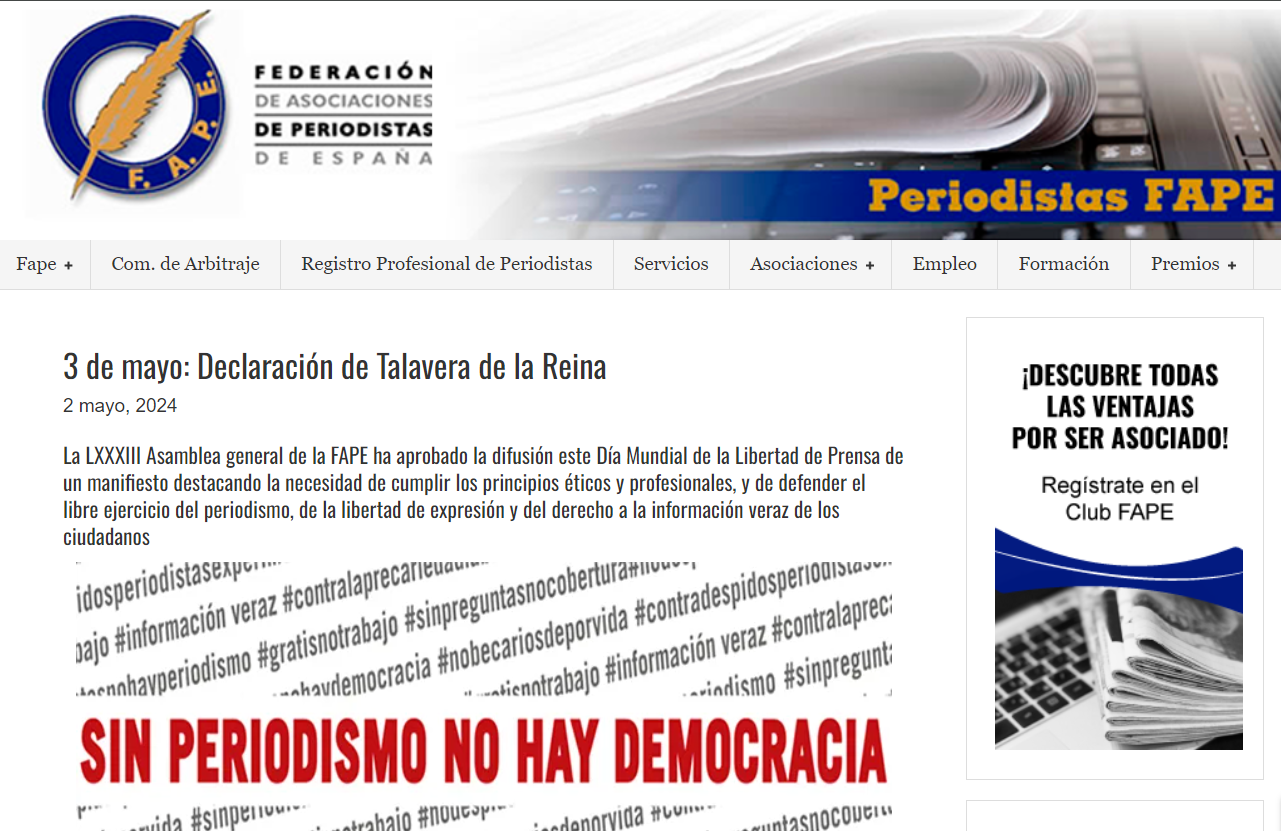 Con motivo del 3 de mayo, día mundial de la libertad de prensa, la Federación de Asociaciones de Periodistas de España ha publicado un manifiesto defendiendo necesidad de cumplir los principios éticos y profesionales, y de defender el libre ejercicio del periodismo, de la libertad de expresión y del derecho a la información veraz de los ciudadanos