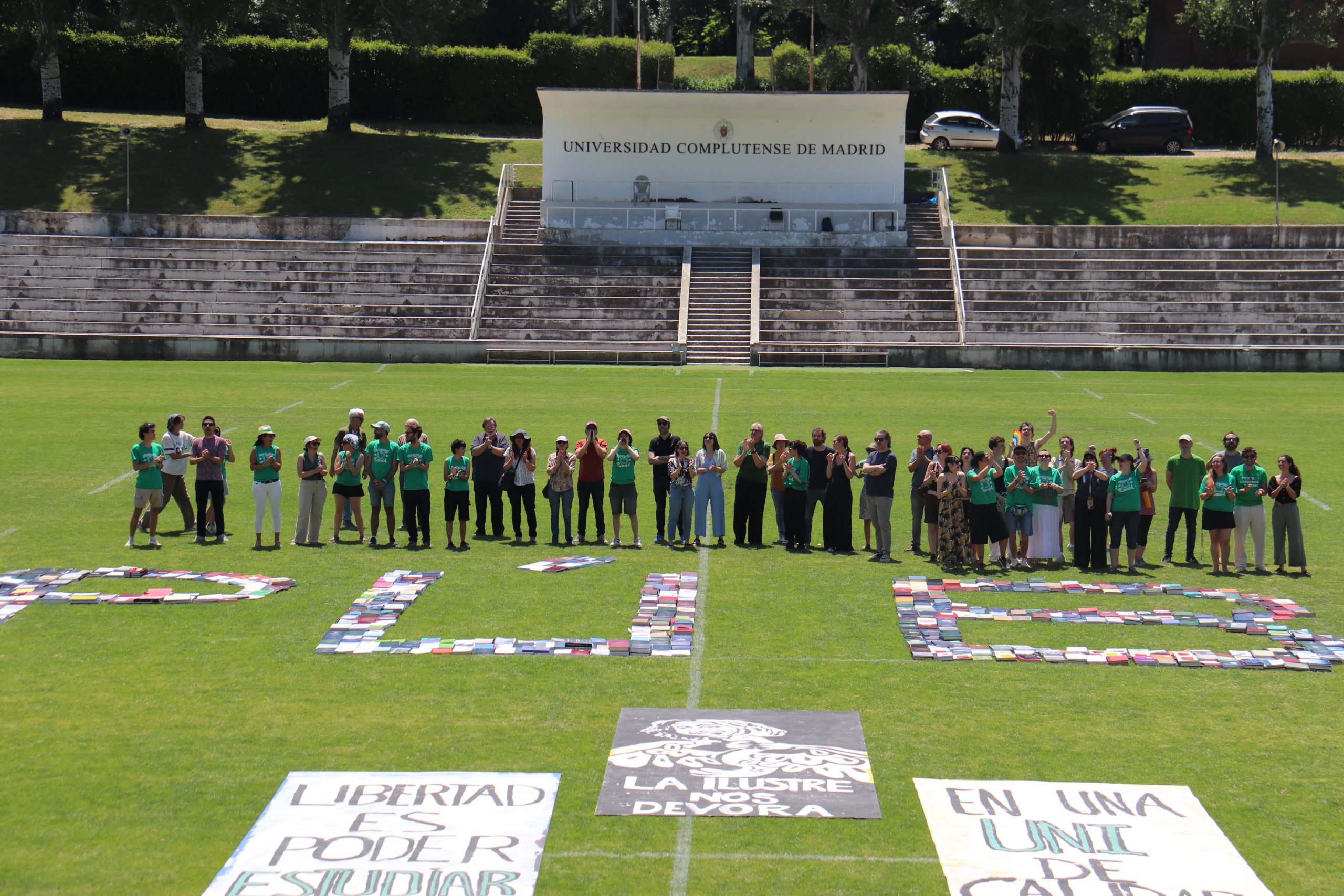 Profesores y alumnos han formado un gran letrero en el Estadio Nacional de la Universidad Complutense de Madrid
