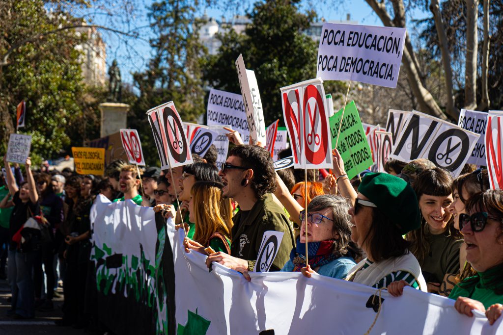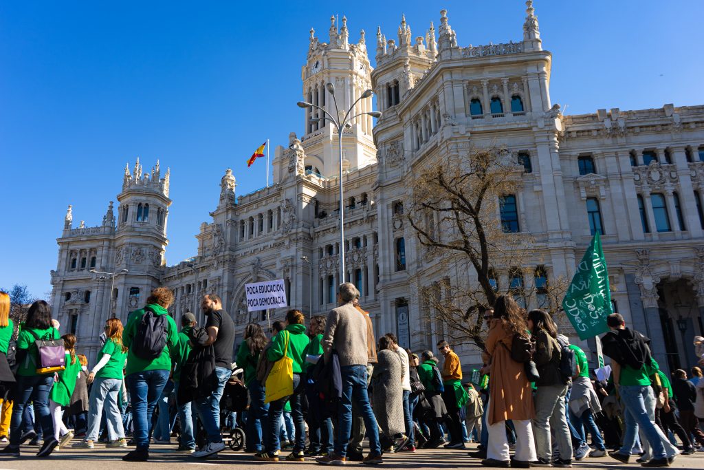 Bajo el lema, “la pública no se toca”, decenas de miles de estudiantes, familias y personal docente abarrotaron la Puerta del Sol el pasado domingo para protestar contra los recortes en educación de la presidenta de la Comunidad de Madrid, Isabel Díaz Ayuso. Según Delegación de Gobierno, fueron 25.000 los asistentes, mientras que las organizaciones cifran la asistencia en 100.000 personas.