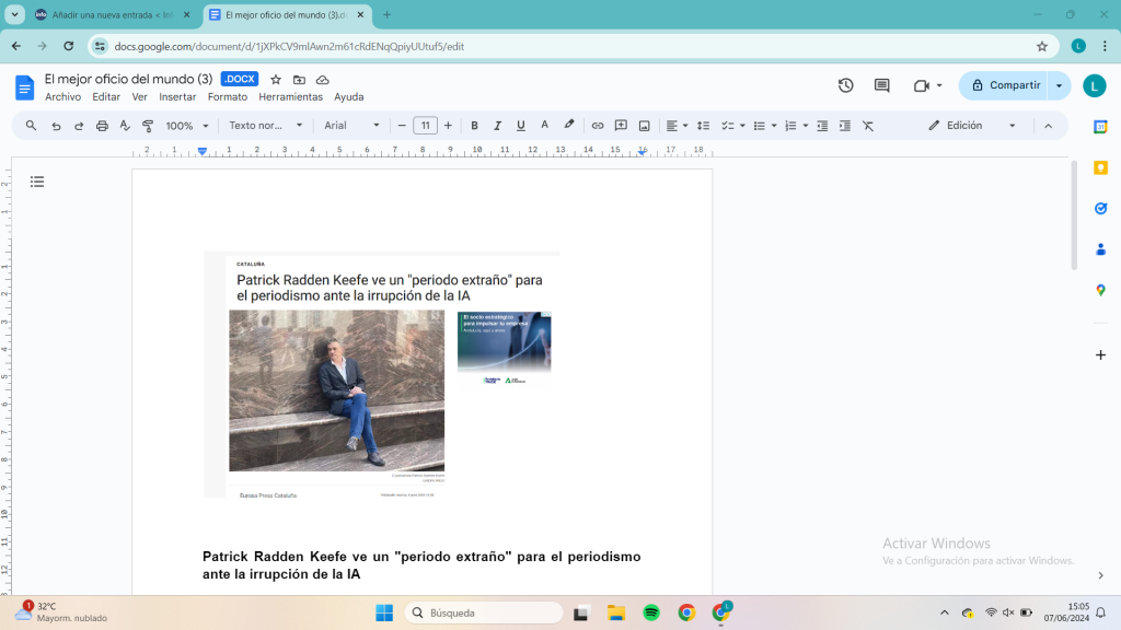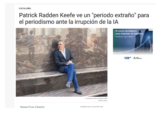 En este artículo de Europa Press, Patrick Radden Keefe, periodista y escritor estadounidense señala que el periodismo vive ahora mismo un “periodo extraño” tras la entrada de la inteligencia artificial (IA), cuyo impacto es desconocido. También habla sobre la importancia de mantener el pensamiento crítico y la regulación necesaria frente a las nuevas tecnologías como las deepfakes, las cuales pueden llevar a la desinformación. Además, destaca que el periodismo se enfrenta a la demonización por parte del mundo de la política y subraya la importancia de proteger a los periodistas independientes.