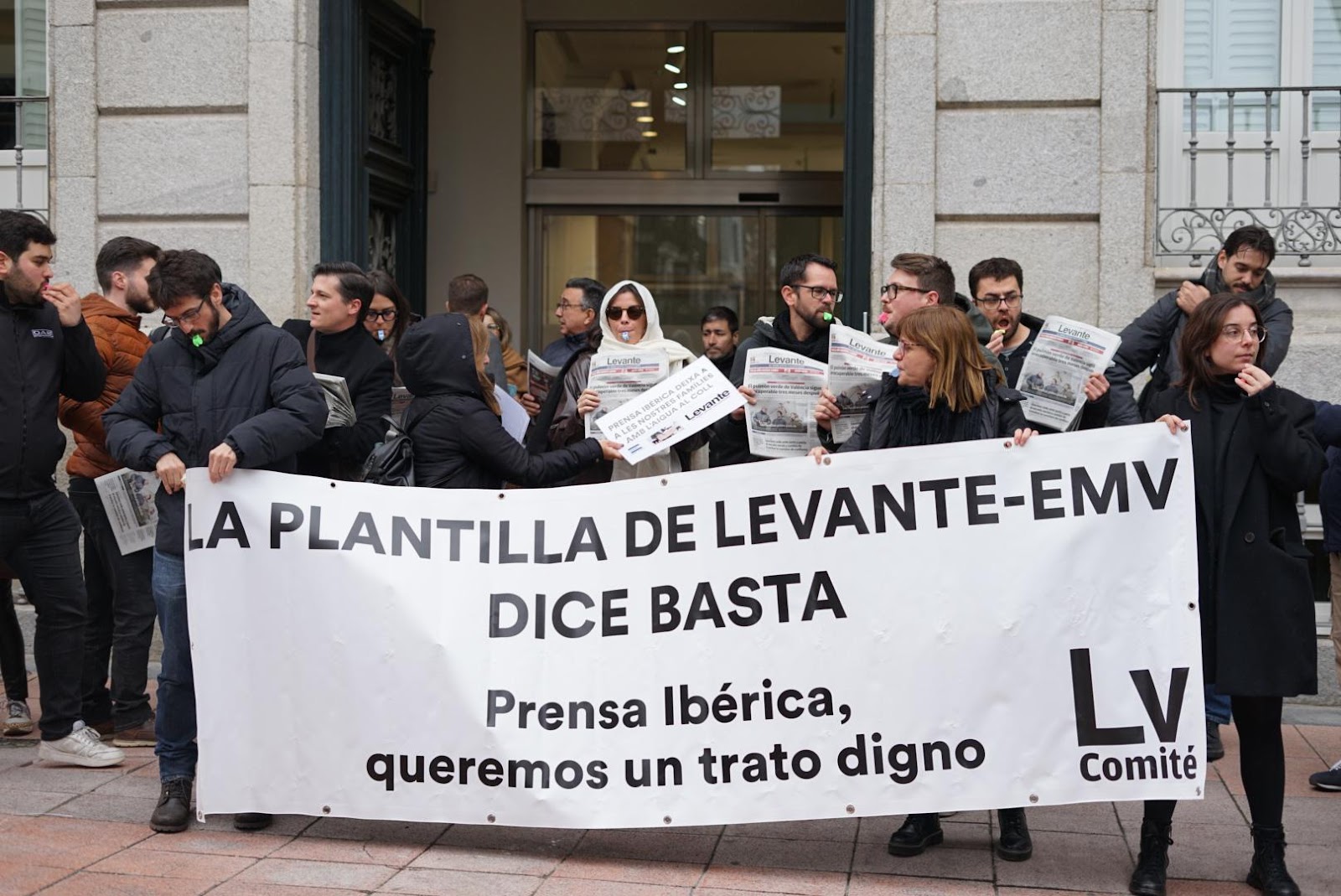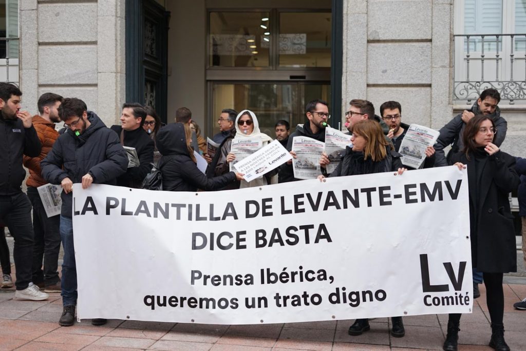Después de los despidos, la plantilla valenciana explotó y, sin negociar el convenio, convocó una huelga: “Los medios de comunicación nunca nos manifestamos, nunca hacemos huelgas. Somos periodistas, somos los que cubrimos las huelgas y los problemas de los demás trabajadores, pero ¿quién da visibilidad a los nuestros?”. Algunos trabajadores del edificio de la calle Pedro Muñoz Seca, sede también de medios como El Periódico y El Periódico de España, se asomaron a los balcones para escuchar la lectura del manifiesto de la comisión de trabajadores del Levante-EMV, pero fueron pocos los que salieron a la calle: “El diario Información, de Alicante y también del grupo, ha venido hoy con nosotros, pero ojalá más medios de Prensa Ibérica se unieran a nuestra propuesta porque al final estamos pidiendo condiciones dignas para todos”, decía Ros.
