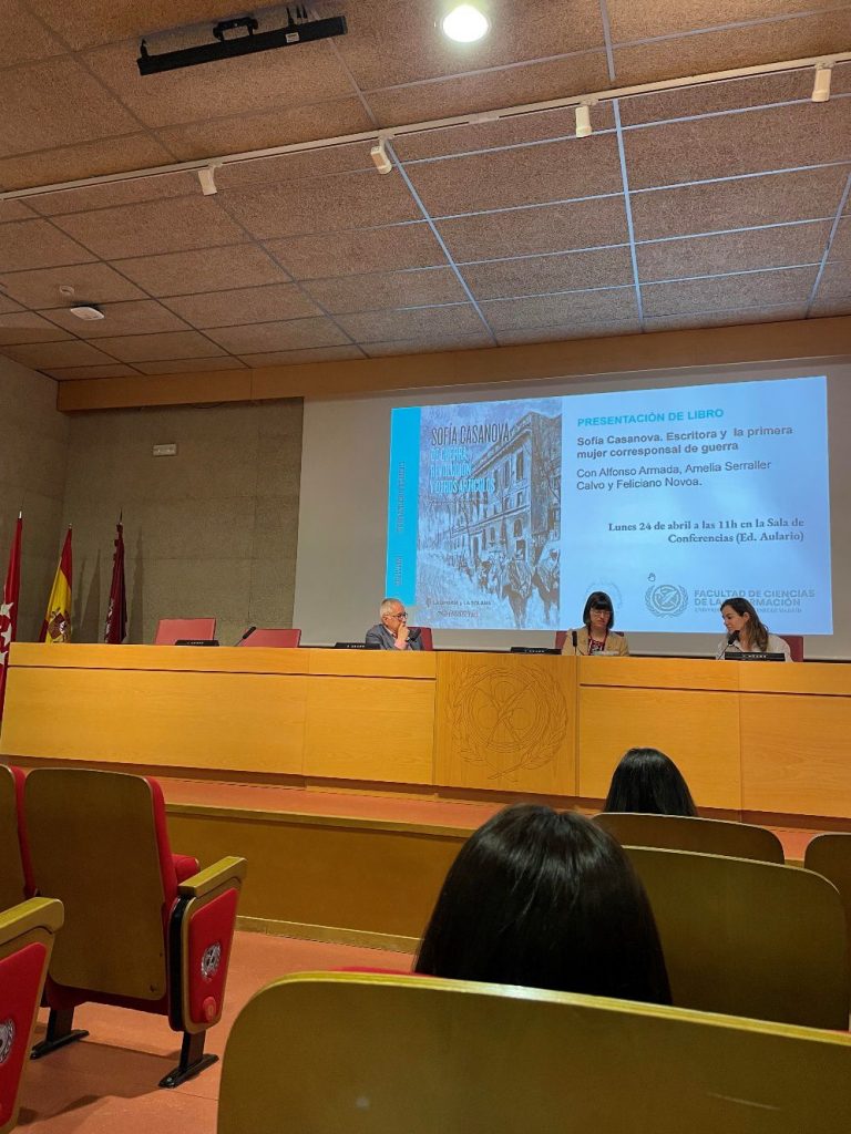 La Facultad de Ciencias de la Información acogió la presentación del libro De guerra, revolución y otros artículos, una antología de crónicas de Sofía Casanova seleccionadas y anotadas por Amelia Serraller. Acompañada por Alfonso Armada, editor y director de la revista digital FronteraD, y por Feliciano Novoa, de la editorial La Umbría y la Solana, Serraller destacó la importancia de dar a conocer el trabajo de Sofía Casanova. Según aseguraron, la forma de contar de la corresponsal gallega sigue estando “plenamente vigente por el talento que la caracterizaba como enorme escritora, así como periodista que se detenía en los detalles con una lucidez y una capacidad de observación admirable”. También hicieron hincapié en su “capacidad de poner en el centro de las historias la condición humana, el sufrimiento de la gente con nombres y apellidos, así como el hecho de estar presente en el lugar de los hechos”. Estos aspectos de la obra de Casanova son los que han permitido que muchas de sus coberturas sean consideradas “impecables e inmejorables”.