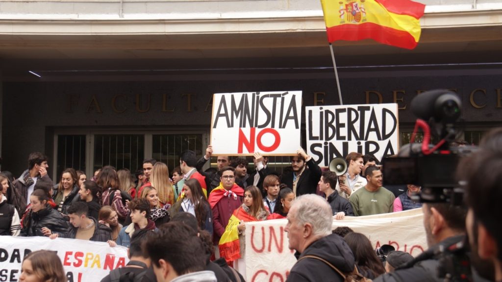 Cerca de doscientos estudiantes se concentraron este martes 14 de noviembre en la Facultad de Derecho de la Universidad Complutense de Madrid. La manifestación, convocada por varias asociaciones estudiantiles como Españoles de a pie, Libertad Sin Ira, S’ha Acabat o Alternativa Estudiantil, se suma a las protestas contra de la Ley de Amnistía que están celebrándose en la sede central del PSOE, en la calle Ferraz.