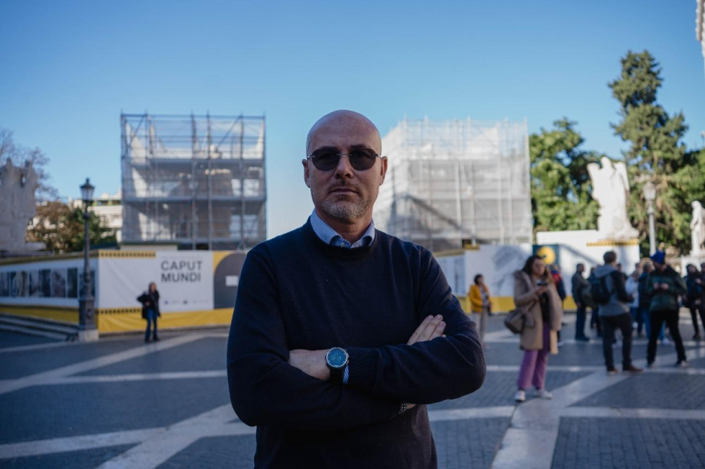 Andrea Silvestrini, secretario general de ANIEP, en la plaza del Campidoglio. Detrás, las estatuas de Dioscúros y Castor y Pólux en proceso de restauración por el Jubileo 2025, el 15 de noviembre de 2024 | Foto: Pedro Pascual