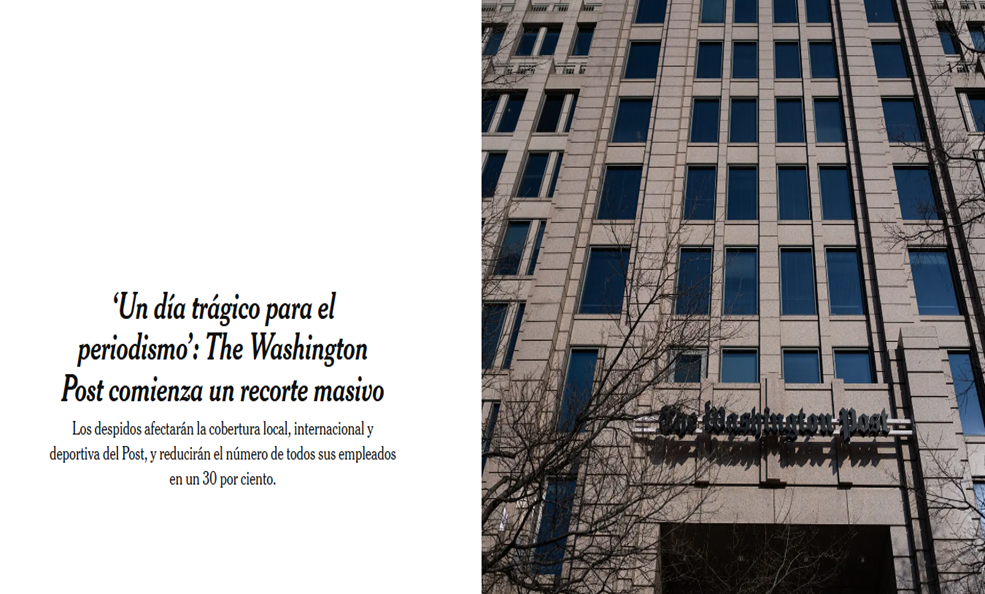 Uno de los golpes más fuertes a la industria periodística se confirmó el día de ayer, cuando Matt Murray, editor ejecutivo de The Washington Post, anunció el despido del 30% de la plantilla, incluyendo a 300 periodistas de la sala de redacción del diario ubicado en la capital estadounidense. Murray ha calificado el hecho como parte de un “reajuste estratégico”, mientras el sindicato de empleados del diario prepara una manifestación en las puertas del medio este jueves.