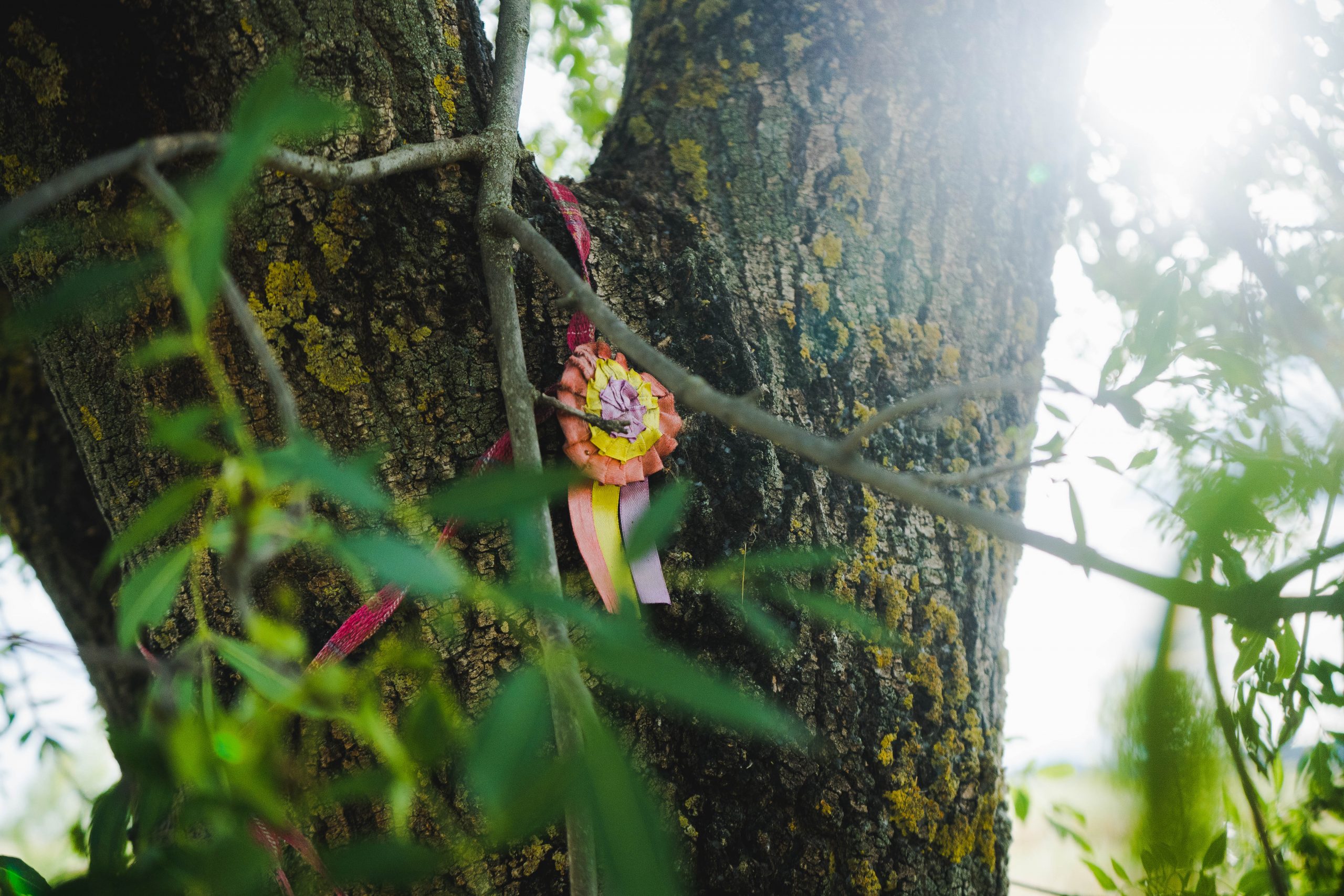 A la vera del tronco, en el suelo, ocultas por la hierba, unas alisadas piedrecitas quedan posadas sobre una cama de azulejos y unos pedazos de cerámica. Aunque las inclemencias del tiempo han borrado la “E” y la “D”, unas letras inscritas en cada uno de los guijarros consiguen inmortalizar el nombre de la fotógrafa en un mosaico artesanal, visible sólo para los ojos de los que saben que está ahí. Sobre el mosaico, unas ramas sostienen una banda y escarapela tricolores. El rojo, amarillo y morado, propios de la iconografía republicana, destacan entre los colores verdes y ocres del paisaje, aportando al árbol un contraste luminoso. No parece haber más autoría que la del anónimo que ha convertido esta localización en uno de los pocos espacios que rinden homenaje a Gerda Taro, a su carrera y su labor.