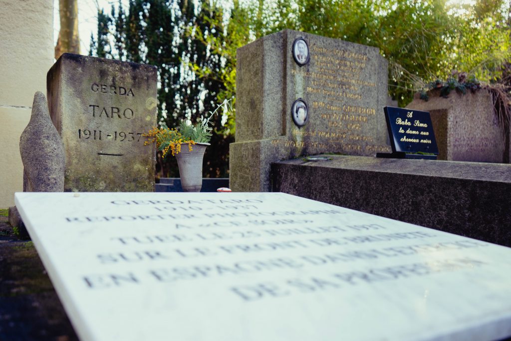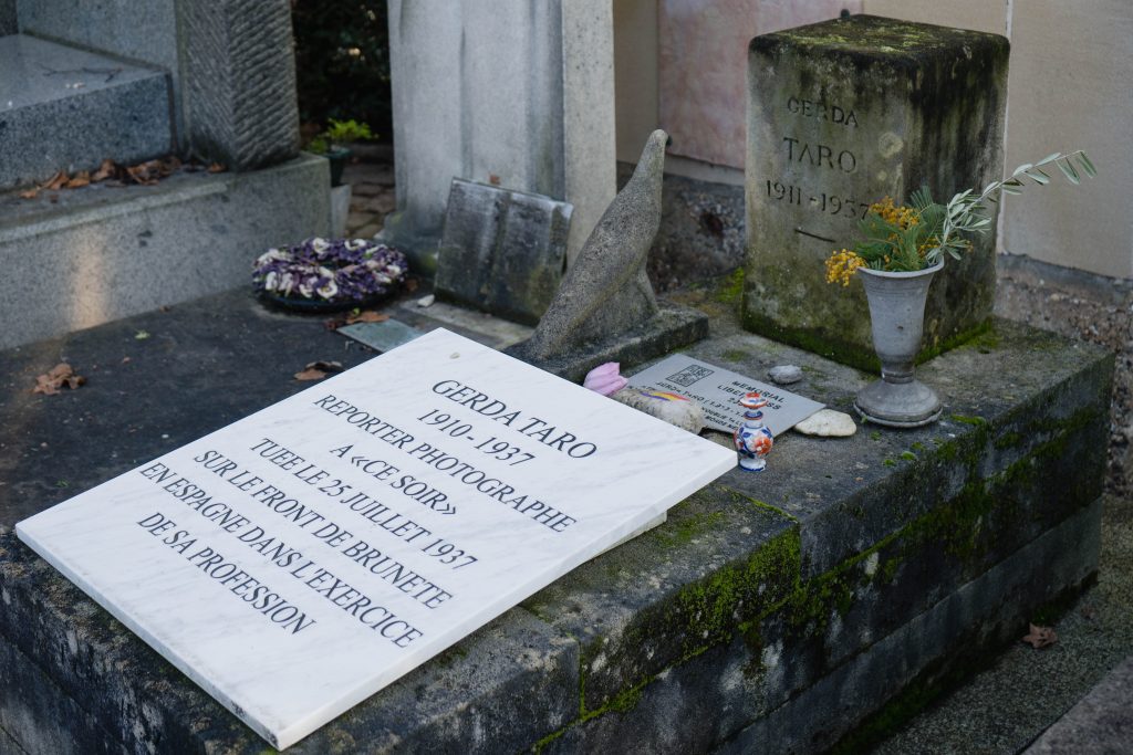 El París que acogió a Gerda cuando huía del nazismo en sus primeros años de juventud volvió a recibirla, pero esta vez con la solemnidad propia de un cortejo fúnebre. El famoso cementerio de Pere-Lachaise, que sepulta los restos mortales de figuras como Chopin, Oscar Wilde o Proust, recibió a Gerda Taro. Su funeral se convirtió en una muestra de apoyo a la República Española. Desde la capital francesa, literatos como José Bergamin, Neruda o Louis Aragón pronunciaron discursos en su honor. El primero de agosto de 1937, el día que hubiera cumplido veintisiete años, Gerda Taro fue enterrada en la sección 97 del cementerio. En una tumba rectangular y sencilla, adornada con dos esculturas en piedra de un halcón y un jarrón, talladas por Giacometti, y muy próxima a la de Largo Caballero, reposan los restos mortales de la primera fotoperiodista que murió cubriendo un conflicto.