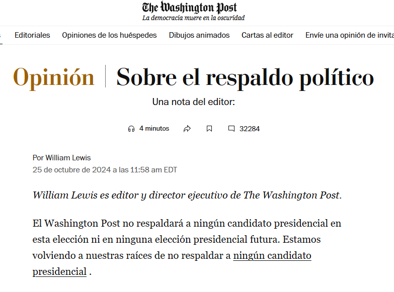 El no posicionamiento del Washington Post, considera Vicente Vallés, responde “al miedo de los propietarios a Donald Trump”, refiriéndose a las amenazas que ha realizado desde sus campañas y desde su condición de presidente, entre 2016 y 2020.